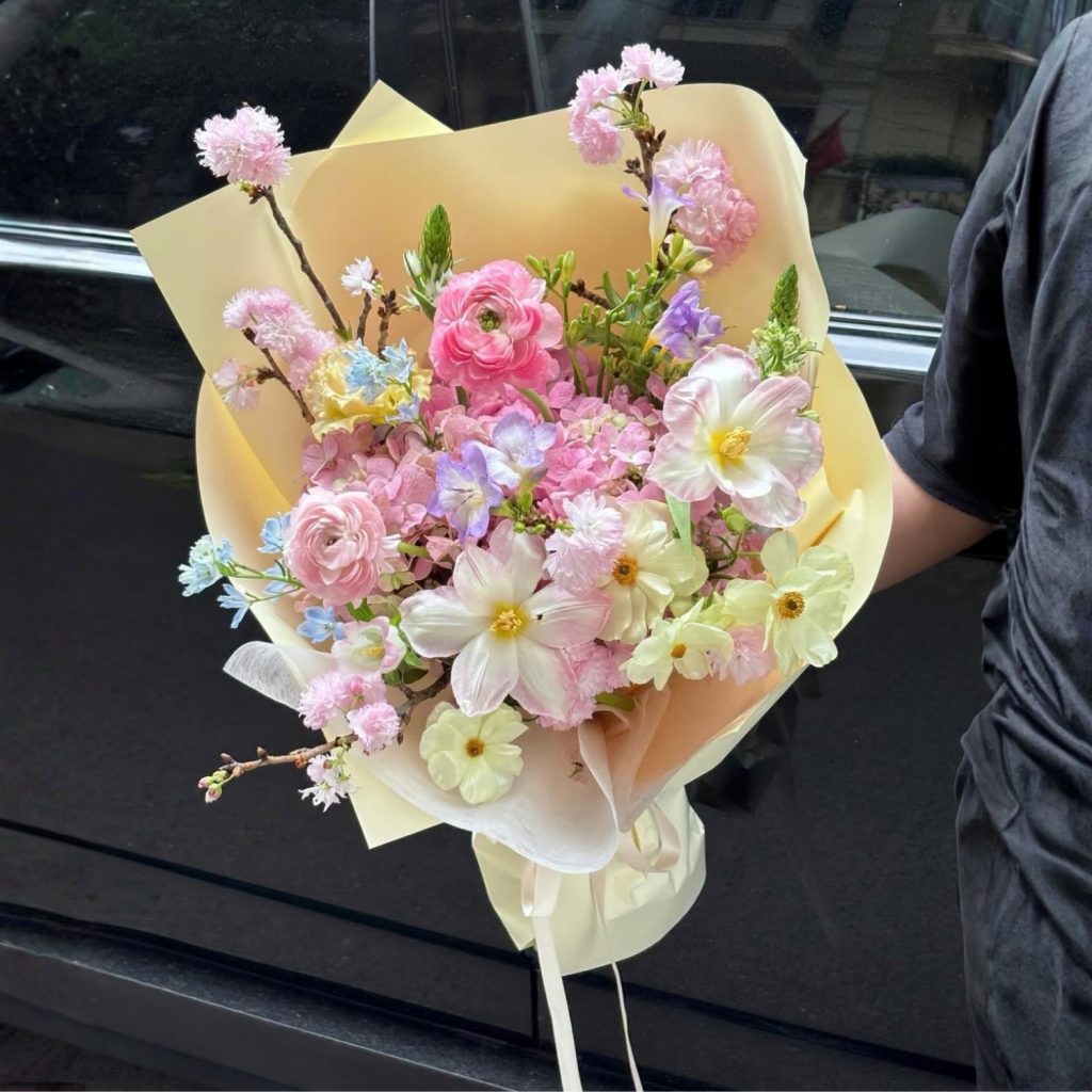 Ngay từ ánh nhìn đầu tiên, tổng thể bó hoa mang tone pastel nhẹ nhàng với sự hòa quyện của hồng, trắng, kem và chút điểm xuyết tím – tạo nên cảm giác trong trẻo, thanh lịch. Lớp giấy gói màu kem ngà được xử lý mềm mại, ôm trọn cấu trúc hoa như một lớp ký ức dịu dàng, khép lại chặng đường cũ và mở ra hành trình mới.