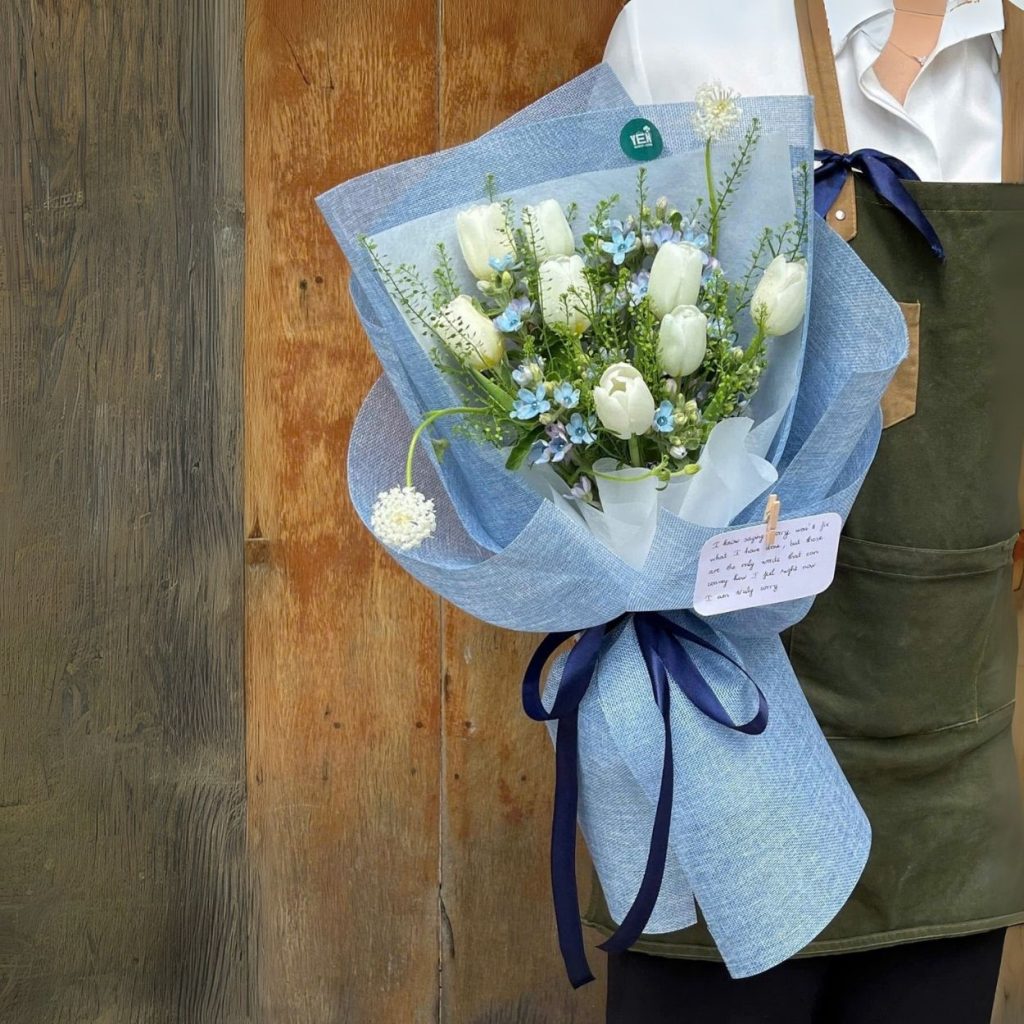 Bó hoa được xử lý theo bố cục chuẩn mực, tán cành cao dần ở trung tâm tạo chiều sâu, hai bên là lớp lá phụ mềm mảnh để nâng đỡ hoa mà không che mất form tulip. Lớp giấy lót trắng mờ ôm sát thân hoa giúp màu tulip nổi bật, bên ngoài là giấy xanh chất liệu lưới có độ rủ nhẹ, khi ánh sáng chạm vào cho hiệu ứng trong trẻo như sương sớm. Nơ ruy băng xanh đậm bản lớn được thắt vừa tay, giữ phom bó chắc chắn, tạo điểm cân bằng thị giác giữa phần hoa và phần giấy. Từng chi tiết đều được tiết chế, không dư thừa, hướng đến một vẻ đẹp tinh khiết nhưng hiện đại.