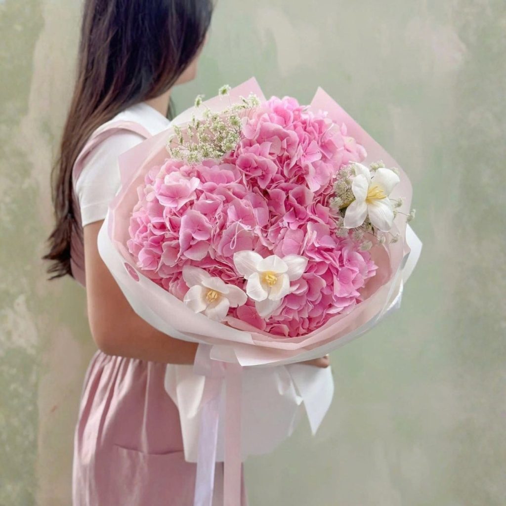 Cẩm tú cầu giữ vai trò trung tâm, được xử lý theo dáng tròn tự nhiên, các cụm hoa nở đều, xếp sát nhưng không nén chặt. Chính độ “thoáng vừa đủ” này tạo nên cảm giác bó hoa có nhịp thở, không bị nặng tay hay cứng khối.