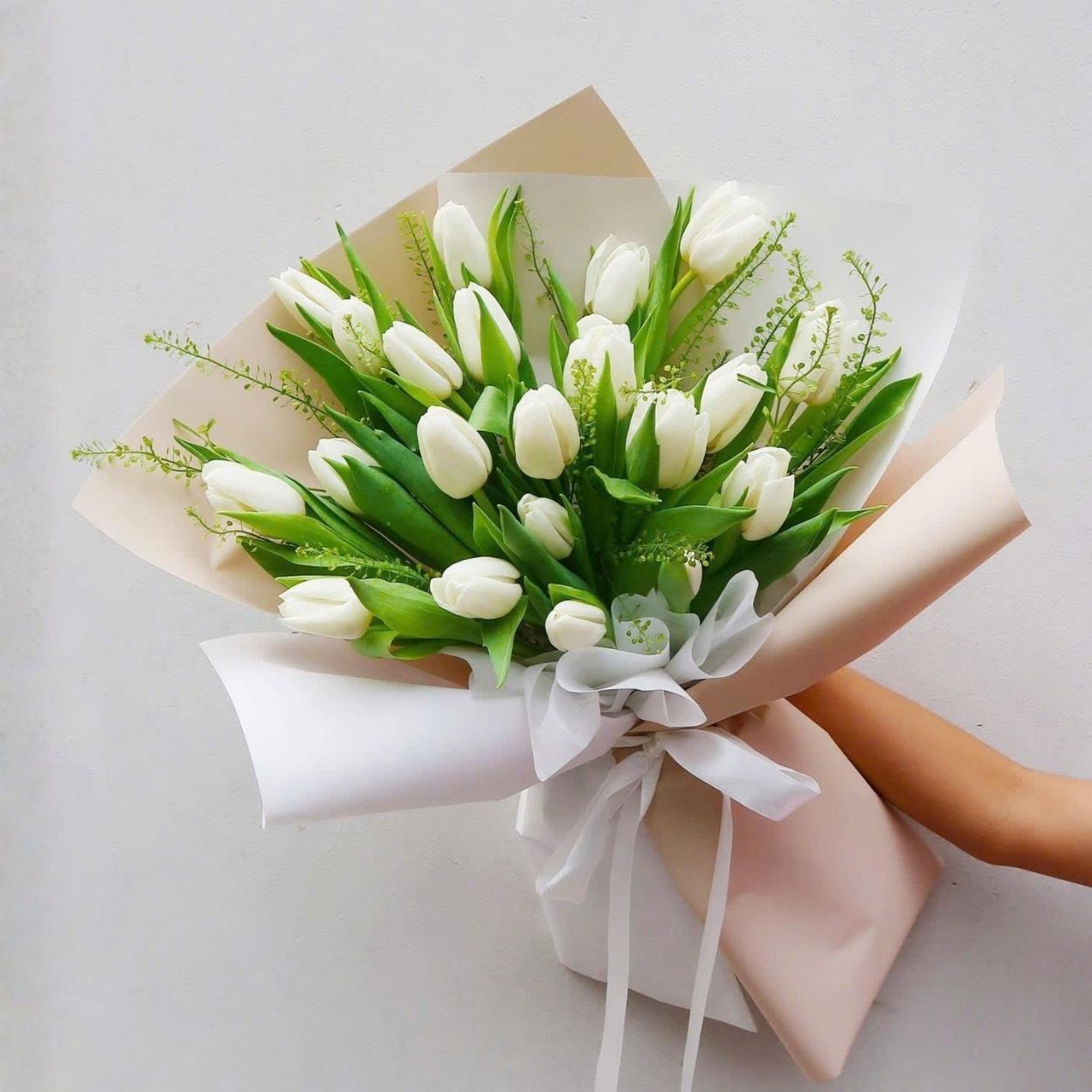 Tất cả được ôm gọn trong lớp giấy gói màu trắng và kem, bề mặt lì mịn để tôn sự trong trẻo của hoa. Phần nơ lụa trắng buộc mềm ở chân bó hoàn thiện diện mạo thanh lịch, giống một lời thì thầm khẽ khàng thay cho tấm thiệp.