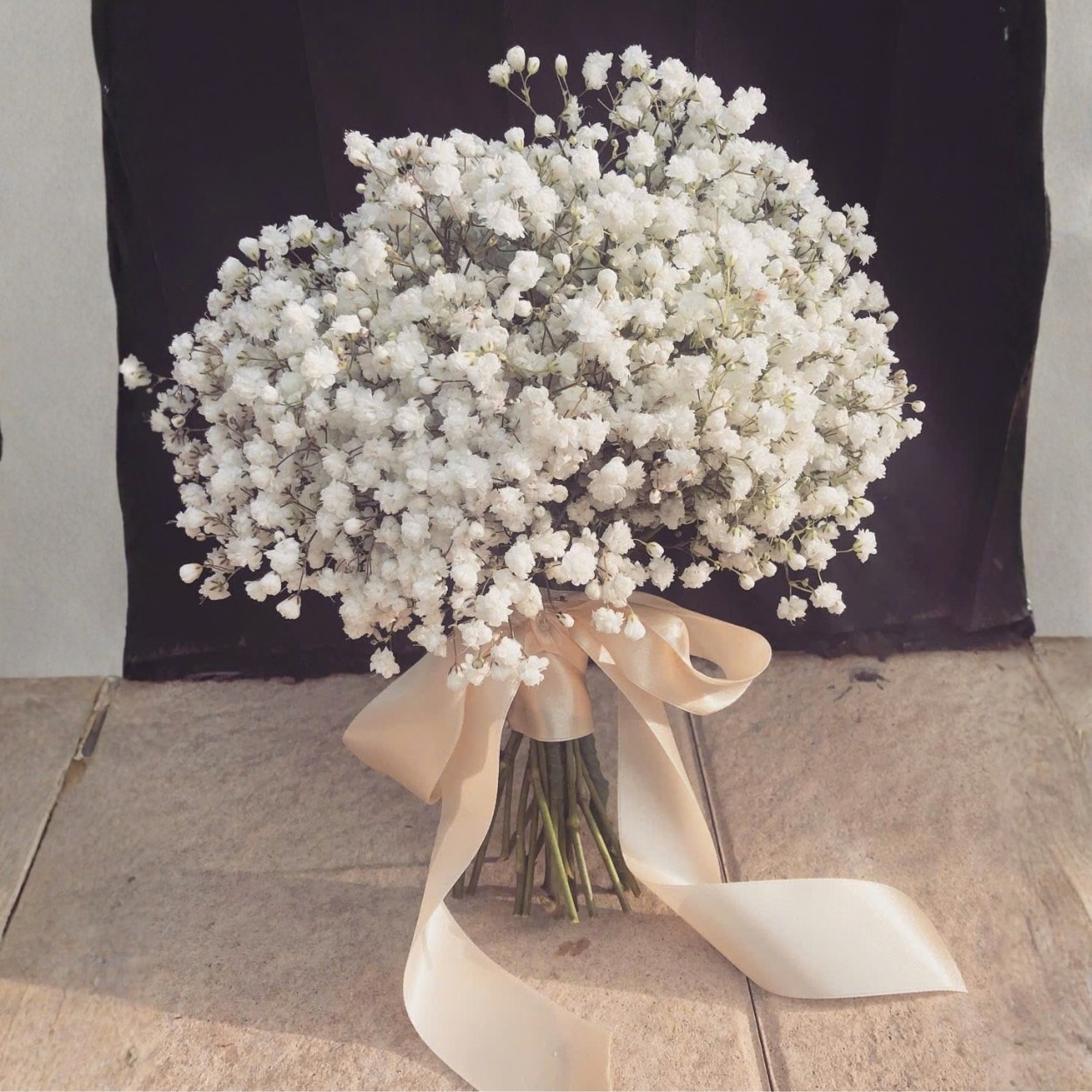 Điểm nhấn của bó hoa là chiếc nơ màu sắc nhẹ nhàng, không quá nổi bật nhưng lại hoàn hảo trong việc làm tôn lên vẻ đẹp thanh thoát của hoa baby. Chúng được buộc vừa khéo léo để tạo nên một cấu trúc hoa cưới đầy tinh tế và sang trọng.