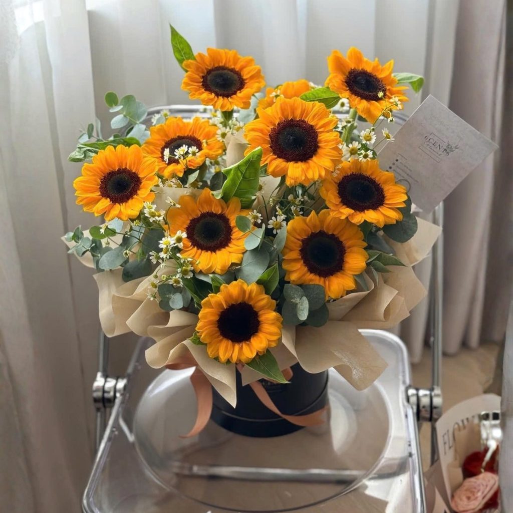 Lẵng hoa “Đồng Hành” là sự hòa quyện hoàn hảo giữa sắc vàng ấm áp của hoa hướng dương và sắc trắng thanh thoát của cúc tana. Hoa hướng dương, với hình dáng tỏa sáng và màu sắc nổi bật, là biểu tượng cho sự lạc quan, sự sống và hy vọng. Mỗi bông hoa hướng dương mang trong mình thông điệp về một tương lai tươi sáng và đầy hứa hẹn.