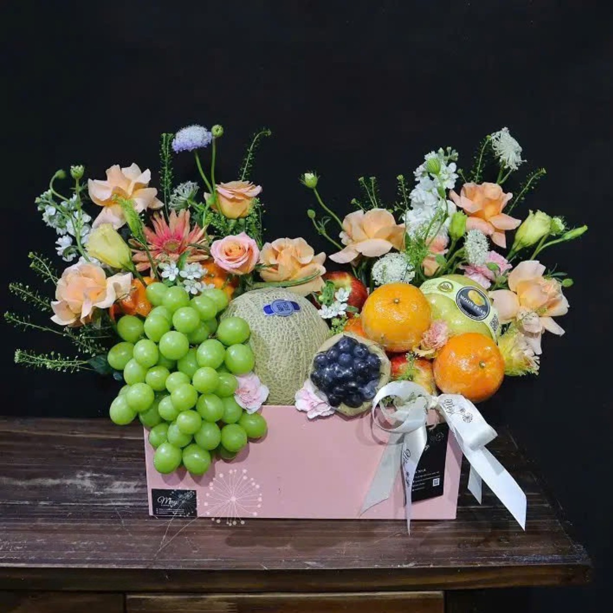 “Từng tầng màu, từng nhịp hương” – đó là cảm giác đầu tiên khi chạm mắt vào “Dòng thời gian”. Sản phẩm đặt trong hộp hồng phấn cột nơ trắng, kể một câu chuyện ngọt lành: trái cây căng mọng làm cột mốc, hoa lá mềm mại là những dòng ghi chú. Sự kết hợp khéo léo giữa sắc cam – xanh – hồng tạo nên nhịp điệu dịu êm nhưng sang trọng, phù hợp đặt trên bàn tiếp khách, góc sảnh hay làm tâm điểm cho một khung hình đáng nhớ.