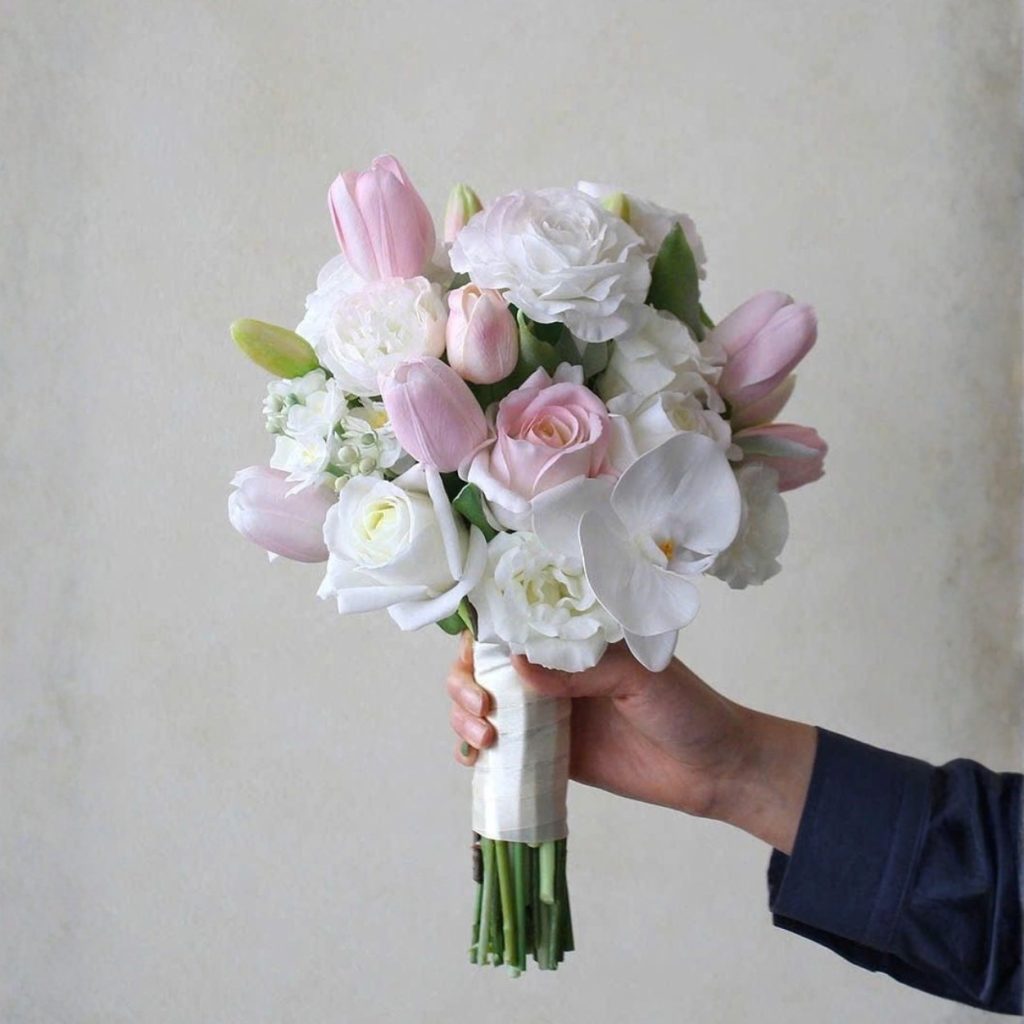 Bó hoa cưới Dreamy Day được thiết kế tinh tế với sự kết hợp hoàn hảo giữa các loài hoa đặc trưng cho tình yêu vĩnh cửu. Những bông tulip trắng thuần khiết là biểu tượng của tình yêu hoàn hảo và sự trung thành. Hoa cát tường mềm mại mang đến sự duyên dáng, nhẹ nhàng, trong khi hoa hồng và lan mang đến sự sang trọng, quý phái. Đặc biệt, phi yến là loài hoa tượng trưng cho sự tươi mới và hy vọng, thêm một chút nét tươi sáng cho bó hoa cưới. Cuối cùng, chiếc nơ trang nhã làm điểm nhấn hoàn hảo, kết nối mọi yếu tố lại với nhau, tạo nên một tác phẩm hoàn hảo cho ngày cưới.