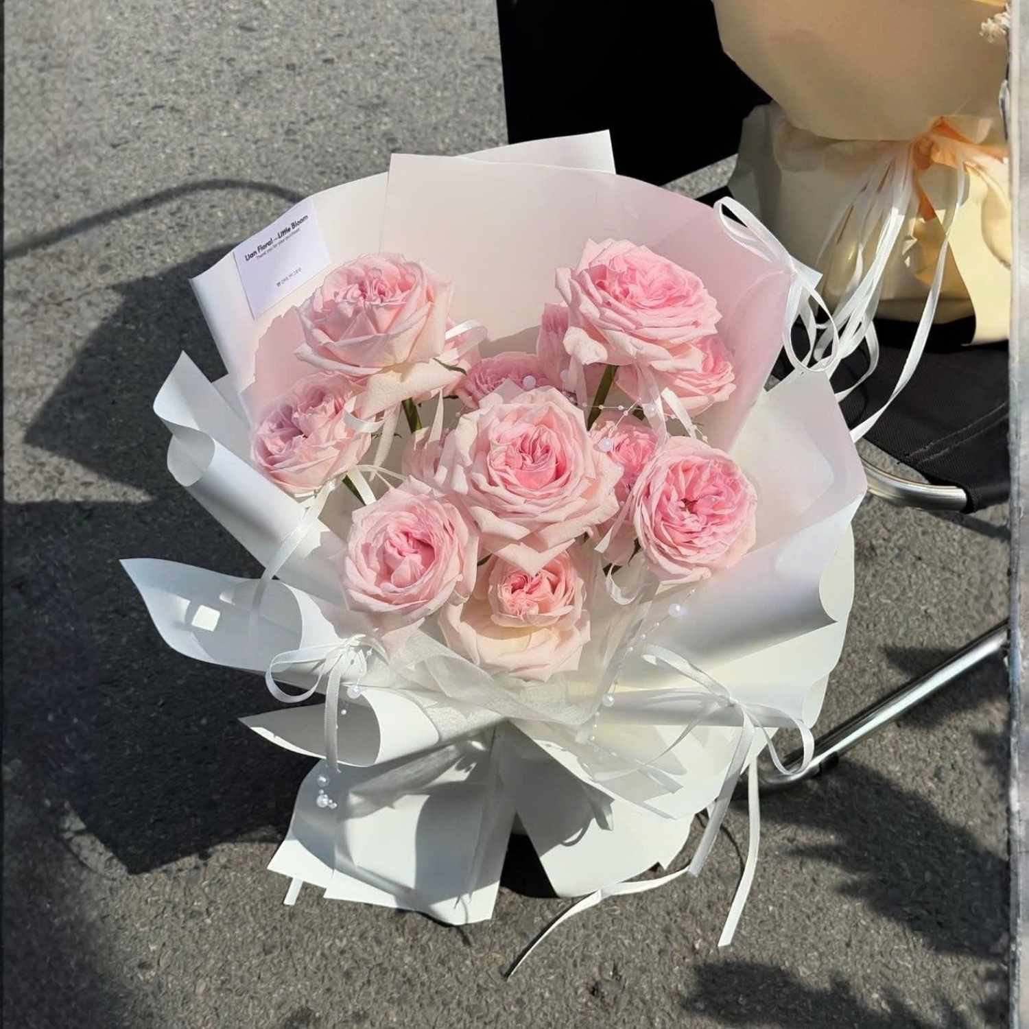 Tổng thể bó hoa giống như một khung hình ánh sáng – nơi sắc hồng trở thành tâm điểm, còn phần giấy gói đóng vai trò nâng đỡ, không lấn át mà chỉ làm nổi bật chủ thể.