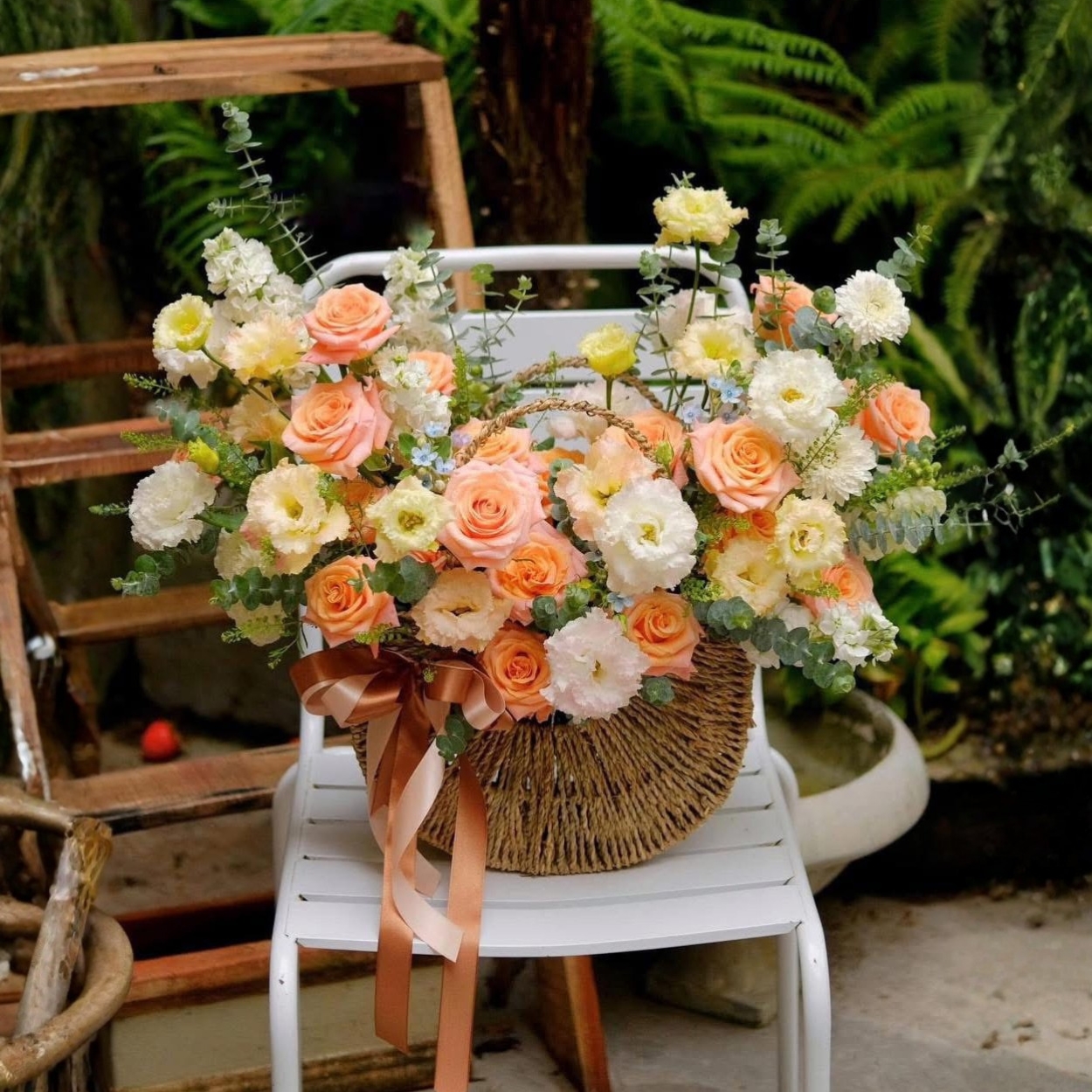 Giỏ hoa này được thiết kế với sự lựa chọn tinh tế từ các loài hoa biểu tượng cho tình yêu mãnh liệt và bền vững. Hoa hồng đỏ thắm là điểm nhấn chính, tượng trưng cho tình yêu cháy bỏng và nồng nàn. Đi kèm với nó là những bông hoa cát tường thanh thoát, mang đến cảm giác nhẹ nhàng và thanh khiết. Những cánh hoa phi yến dịu dàng tạo nên một lớp nền mềm mại, góp phần làm nổi bật vẻ đẹp của những loài hoa chính.