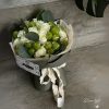 Ngay khi mở hộp, Elevate Elite gây thiện cảm bằng bảng màu xanh trắng rất mát mắt. Tầng táo xanh căng mọng ôm lấy cụm hồng trắng như men sứ, điểm xuyết lá bạc xanh lì giúp tổng thể cân bằng giữa độ bóng và độ mờ. Lớp giấy gói tông xanh rêu phối giấy lót kem nhạt, kết thúc bằng dải nơ trắng bản lớn mềm rũ, khiến bó hoa nhìn vừa hiện đại vừa dịu dàng. Đây là kiểu đẹp không cần phô trương, chỉ cần đặt xuống là sáng bừng cả góc phòng.