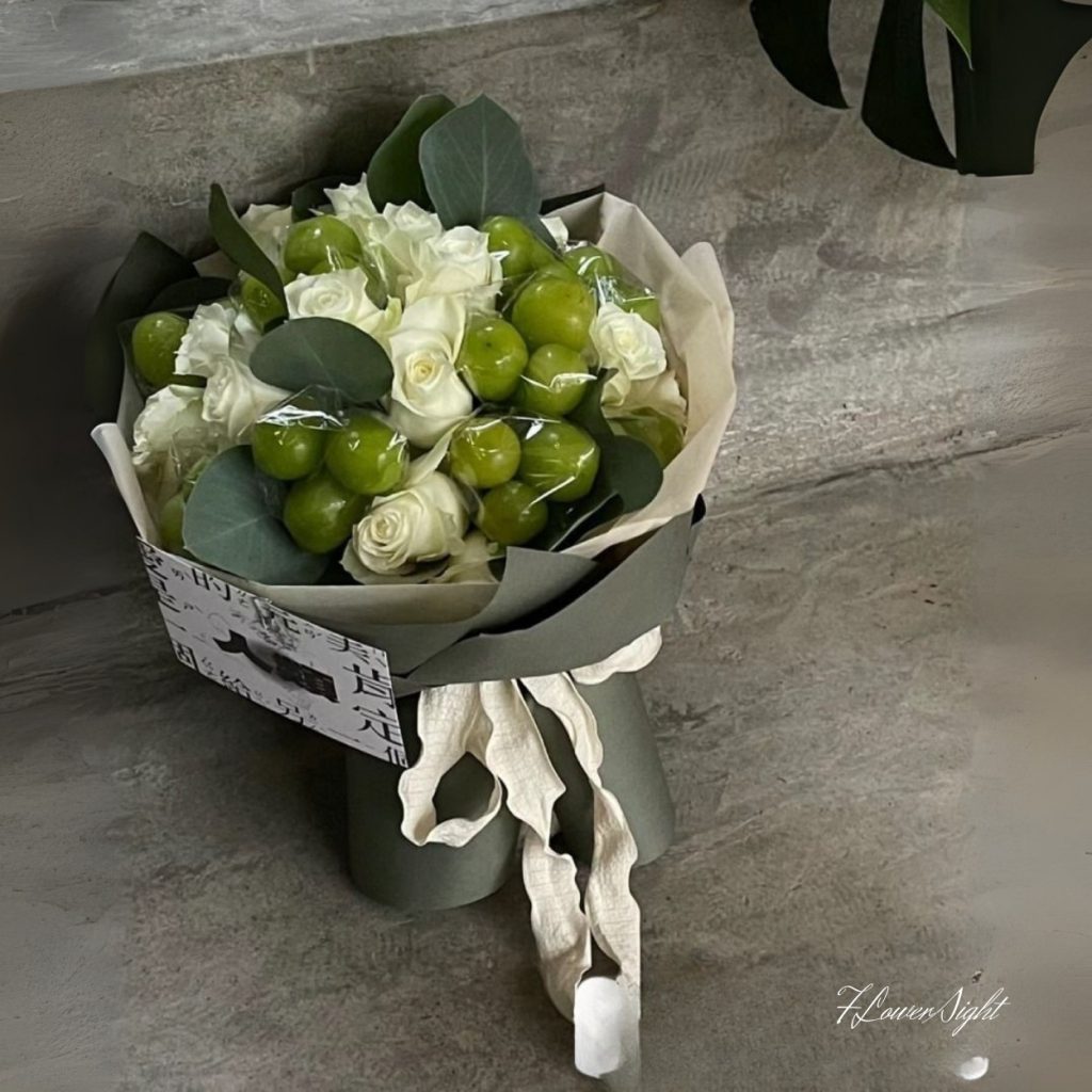 Bố cục được xử lý theo dáng tròn gọn, phần tâm là hồng trắng nở vừa phải để giữ cánh dày và phom tròn. Vành ngoài xếp xen kẽ táo xanh, mỗi quả đều được bọc trong suốt để giữ độ bóng và vệ sinh khi di chuyển. Các mảng lá eucalyptus xanh xám chạy dọc những khoảng nghỉ tạo chiều sâu, khiến khối trái trở nên nổi bật nhưng không nặng mắt. Mảng giấy gói được gấp khúc rõ ràng, mép giấy dựng đứng như chiếc cổ áo thanh lịch, trong khi chiếc thẻ trang trí nền trắng chữ đen đóng vai trò một dấu chấm câu tinh quái cho cả thiết kế.