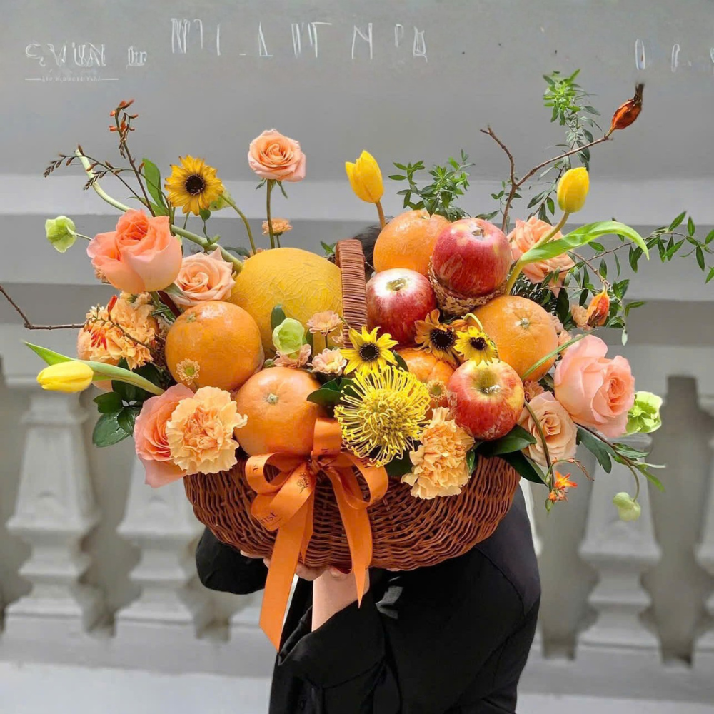 Tông chủ đạo là cam – vàng (cam chín, dưa gang vàng, cúc nhụy kim nếu có), được làm dịu bằng hồng đào của hoa hồng và xanh non từ lá. Sự tương phản cam – đỏ của táo giúp bức tranh có chiều sâu. Giỏ mây nhuộm nâu tạo nền mộc, làm nổi các lớp màu tươi; chiếc nơ satin màu cam là “dấu chấm câu” hoàn hảo cho tổng thể. Toàn bộ chất liệu hướng đến cảm giác sạch – tươi – gần gũi, hợp với phong cách quà tặng hiện đại.