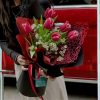 Tulip trong bó được sắp xếp theo dáng mở, các bông hoa vươn lên vừa đủ, tạo cảm giác chuyển động mềm mại. Màu hồng của tulip không quá ngọt, thiên về sắc trầm, gợi sự chín chắn và chiều sâu – như một tình cảm đã qua nhiều lớp thời gian nhưng vẫn giữ được sự ấm áp ban đầu.