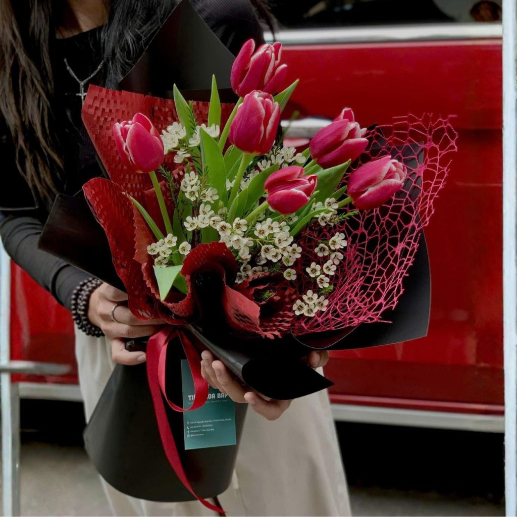 Ngay từ ánh nhìn đầu tiên, bó hoa thu hút bởi sắc tulip hồng đậm nổi bật trên nền giấy gói tối màu. Không phô trương, không cầu kỳ, “Every Second” chọn cách chạm đến cảm xúc bằng sự tiết chế có chủ đích, để vẻ đẹp của hoa được dẫn dắt tự nhiên và trọn vẹn.