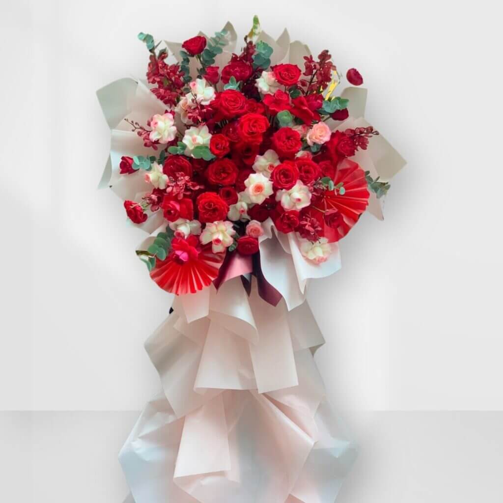 Hoa hồng Ohara đỏ tượng trưng cho tình yêu, sự kính trọng và lòng biết ơn, tạo nên một tổng thể hài hòa và tinh tế. Kệ hoa này không chỉ là món quà tuyệt vời cho khai trương mà còn làm nổi bật không gian văn phòng, cửa hàng mới.