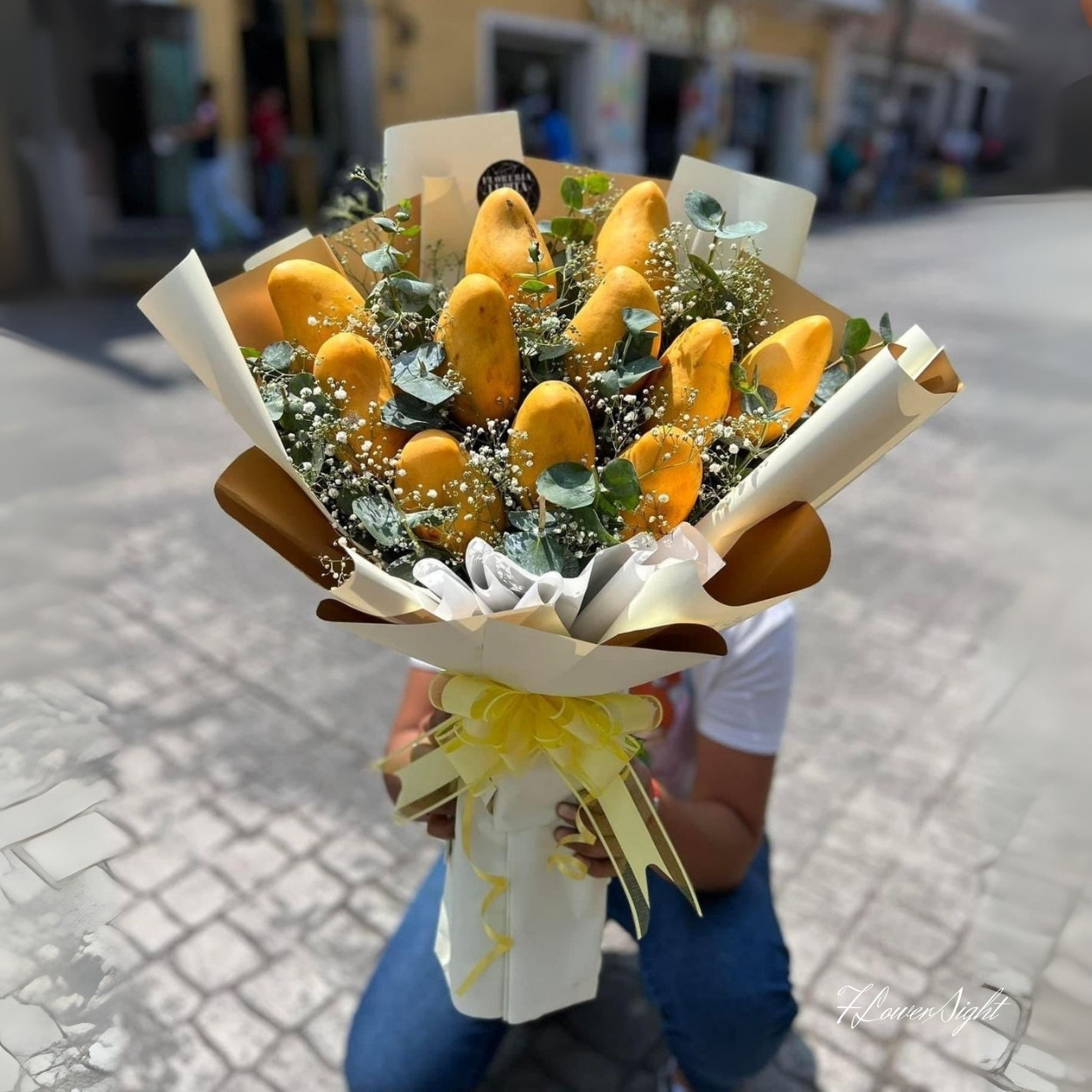 Đây không chỉ là bó hoa trái cây để ngắm. Chúng tôi chọn xoài chín vừa, thịt chắc, hương thơm nhẹ; từng quả được cố định bằng que thực phẩm an toàn và bọc bảo vệ tại điểm tiếp xúc. Khi muốn thưởng thức, chỉ cần rút nhẹ theo chiều thẳng, rửa sạch rồi cắt miếng. Baby và lá bạc tiếp tục giữ vai trò trang trí, giúp bó vẫn đẹp mắt sau khi bạn lấy bớt trái.