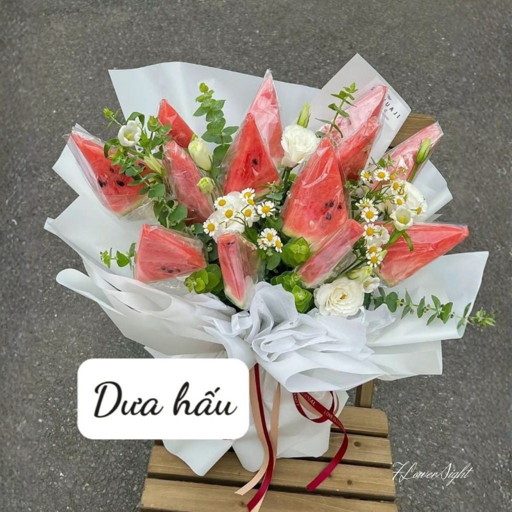 Bố cục bó theo form bán tròn hiện đại. Tầng trái cây được chia thành nhiều cụm nhỏ, mỗi cụm 2 đến 3 miếng dưa hấu đặt so le để tạo nhịp điệu. Lá bạc mini và cành xanh mảnh lướt dọc theo mép từng múi dưa, lấp khoảng trống khéo léo để tổng thể trông đầy đặn mà vẫn thoáng mắt. Cát tường được đặt ở các “điểm nghỉ” giữa lớp trái cây, giúp chuyển mảng màu êm và nhấn vào cảm giác dịu ấm đặc trưng của dòng bó trái cây phong cách nữ tính.