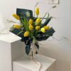 Thành phần gồm tulip vàng tuyển chọn, lá phụ tạo khối, giấy gói cao cấp và nơ lụa. Mỗi bông tulip đều được cân chỉnh độ cao, hướng mặt và góc nở để bó hoa nhìn hài hòa ở mọi phía. Lớp lá nền vừa che chắn cuống vừa tạo khung giúp tulip đứng vững, hạn chế va chạm trong quá trình di chuyển.