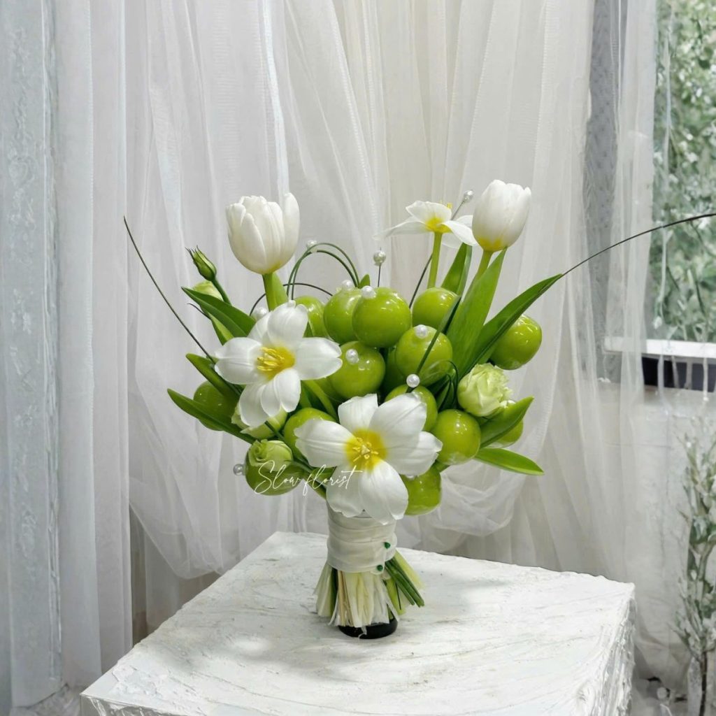 Ngày cưới là khoảnh khắc mà mỗi cô dâu mong đợi, một khoảnh khắc thiêng liêng và đầy kỷ niệm. Và trong ngày trọng đại này, bó hoa cưới “First Love” sẽ là điểm nhấn hoàn hảo, khiến bạn trở nên thật xinh đẹp và lộng lẫy. Được làm từ những bông hoa tulip tinh tế, kết hợp với nho và cát tường, bó hoa này không chỉ mang lại sự tươi mới mà còn tượng trưng cho tình yêu vĩnh cửu và sự khởi đầu ngọt ngào.