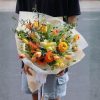 Ngay từ ánh nhìn đầu tiên, FlowerCorner cho cảm giác “năng lượng mà dịu êm”: những đóa tulip cam – đào vươn mình tươi tỉnh, xen giữa là mao lương tròn đầy như mặt trời nhỏ, điểm nét tơ mảnh của thúy châu và cụm hoa cà rốt trắng lấp lánh. Tất cả gom lại thành một bó hoa garden đúng nghĩa – thoáng, nhiều lớp, có khoảng thở, để mỗi nhánh xanh và mỗi bông chính đều được “lên hình” đẹp nhất.