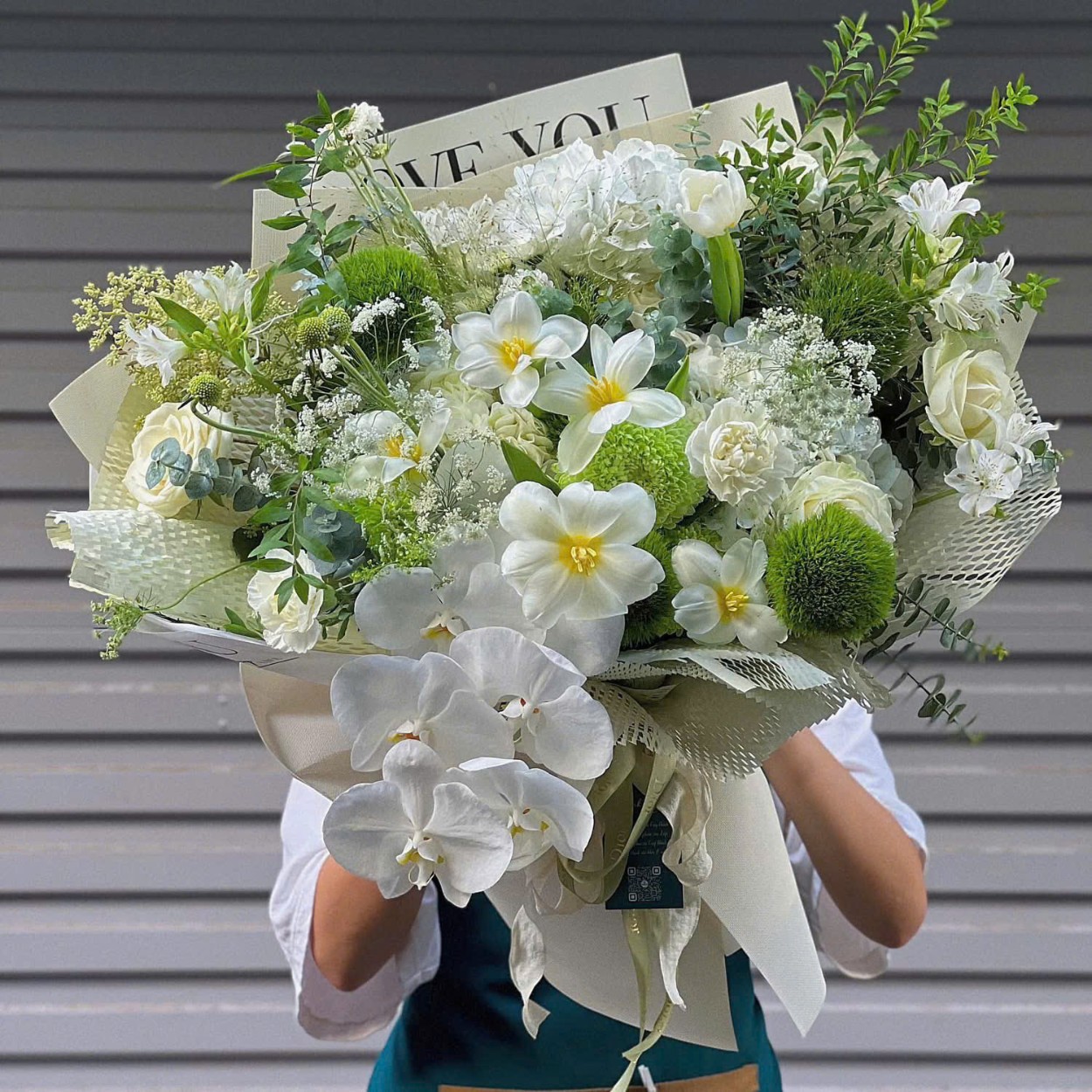 Tổng thể bó hoa mang gam trắng – xanh non – ánh kem, được xử lý theo bố cục tự nhiên, mở rộng về chiều ngang. Hoa không xếp dày, không phô trương, mà được “đặt” đúng vị trí để mỗi loài đều có không gian thở.