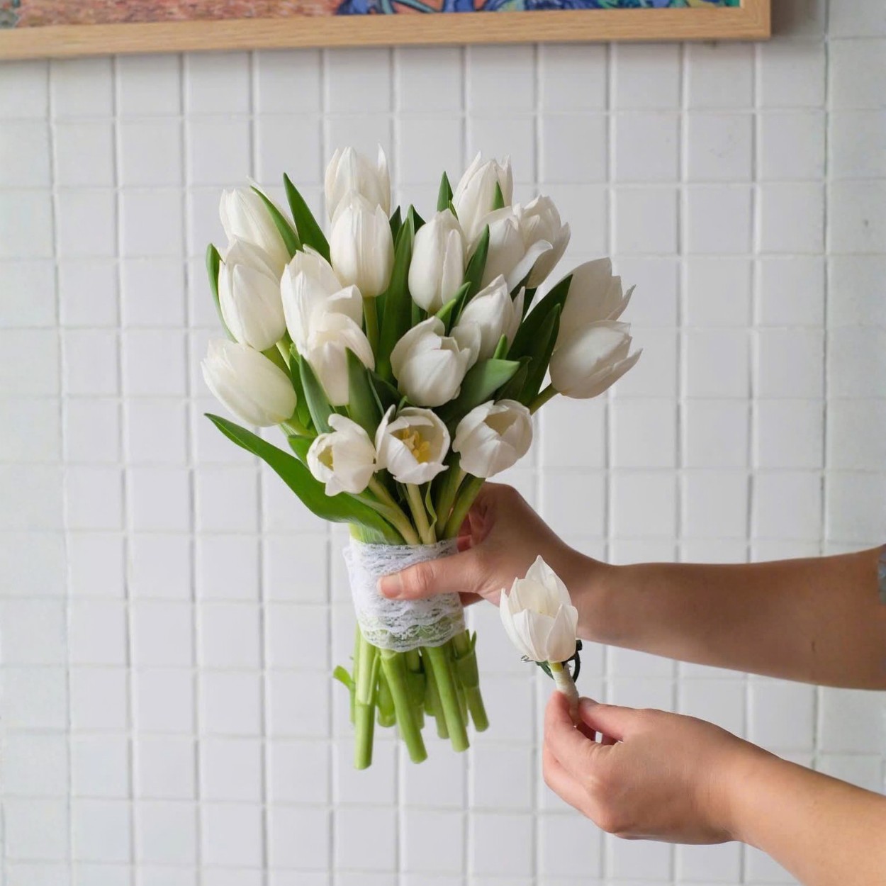 Bó hoa cưới “Forever Harmony” là sự kết hợp hoàn hảo giữa những bông tulip tươi thắm, hoa lá phụ như cát tường và một chiếc nơ thanh thoát. Tulip, với hình dáng đơn giản nhưng đầy quyến rũ, mang đến sự tinh tế và nhẹ nhàng cho cô dâu. Đây là loài hoa biểu tượng của sự hoàn hảo và tình yêu thuần khiết, phù hợp với những cặp đôi yêu thích sự thanh lịch.