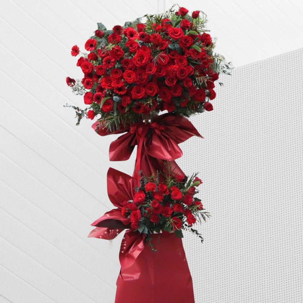 Hoa hồng đỏ vốn được xem là biểu tượng của sức hút và thành công, trong khi đồng tiền lại gợi liên tưởng đến sự hanh thông, thuận lợi. Khi hai yếu tố này kết hợp, kệ hoa trở thành một lời chúc trực diện nhưng vẫn đầy tinh tế.