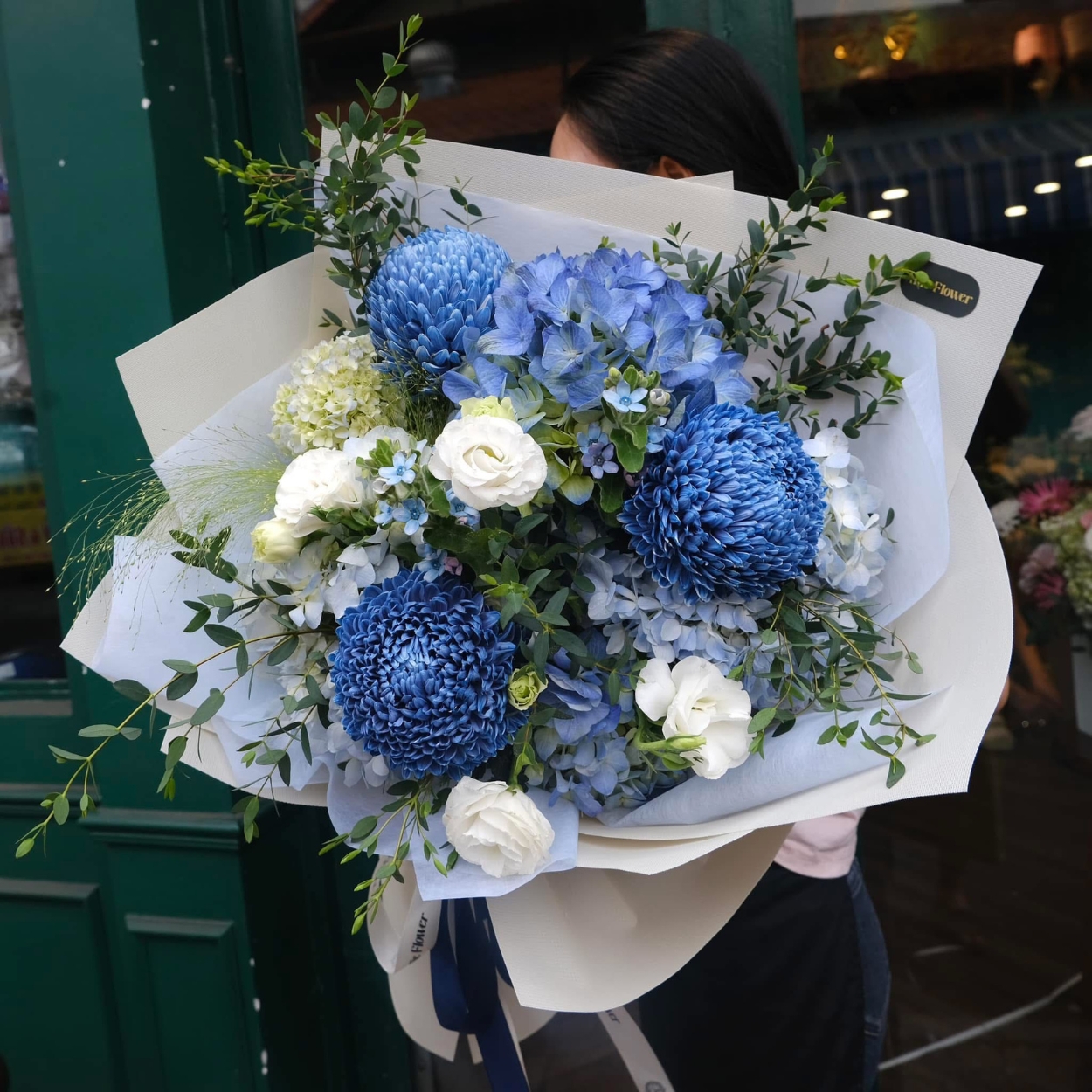 Cúc mẫu đơn, loài hoa tượng trưng cho sự duyên dáng và dịu dàng, kết hợp cùng cẩm tú cầu, biểu tượng của sự biết ơn và tình cảm chân thành, tạo nên một tổng thể hoàn hảo, tinh tế. Cát tường và sao xanh là những điểm nhấn làm cho bó hoa thêm phần sắc nét, thể hiện tình yêu sâu sắc và sự chung thủy. Cuối cùng, lá kiếm và nơ cùng giấy gói tạo nên một bó hoa không chỉ đẹp mà còn mang đến cảm giác mạnh mẽ về sự kết nối và hạnh phúc trọn vẹn.