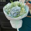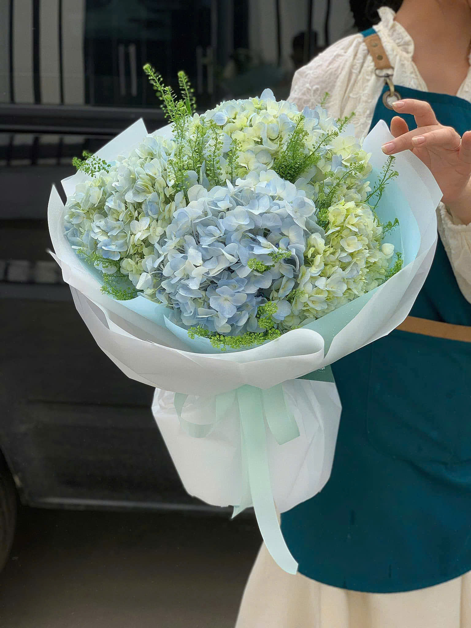 Toàn bộ bố cục bó hoa được xây dựng theo dáng tròn tự nhiên, tập trung vào độ đầy đặn của hoa cẩm tú cầu. Những cánh hoa mềm, mỏng, xếp lớp khéo léo tạo nên hiệu ứng bồng bềnh, như một đám mây xanh nhạt đang khẽ trôi. Sắc xanh chủ đạo không đơn điệu, mà chuyển nhẹ từ xanh pastel sang ánh kem nhạt, giúp tổng thể có chiều sâu và cảm giác rất “thoáng”.