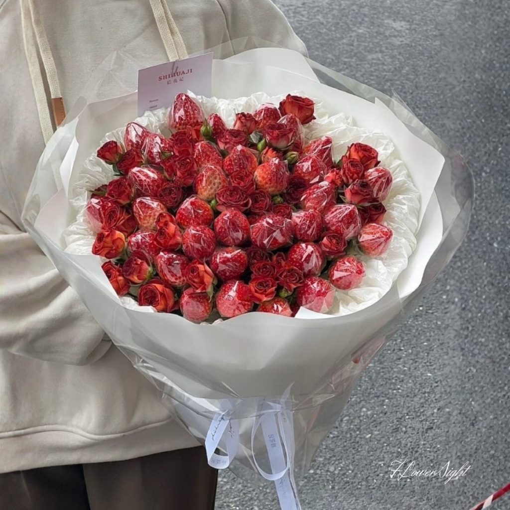 Ý tưởng chủ đạo của bó là định nghĩa lại sự kiêu sa bằng những chất liệu rất gần gũi. Lớp trái dâu tây được đặt so le cùng cụm hoa hồng đỏ – loại bông cánh dày, màu thuần sâu – giúp tạo nhịp điệu thị giác: trái lớn – nụ nhỏ – bông nở, liên tiếp mà không rối. Các quả dâu đều được bọc kín từng trái, giữ vệ sinh khi di chuyển và giúp bề mặt trái phản quang dưới lớp kính, nhìn căng mọng hơn. Ở tầng rìa, giấy trắng tạo “vòng mây” nâng phần mặt bó, giúp form tròn không bị chìm vào nền áo hay phông màu tối. Toàn bộ tông màu giới hạn ở đỏ – trắng – trong, cho cảm giác thanh lịch, hiện đại và rất ăn ảnh.