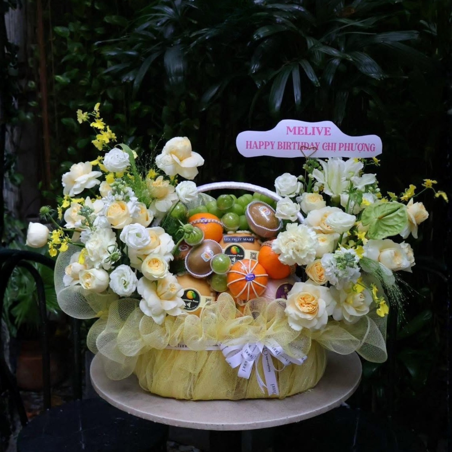 Golden Harvest không đơn thuần là một giỏ quà, mà là một bố cục nghệ thuật nơi hoa và trái cây cùng kể một câu chuyện về sự tròn đầy và tinh tế. Ngay từ ánh nhìn đầu tiên, tổng thể nổi bật với gam vàng kem dịu nhẹ, đan xen sắc xanh của nho mẫu đơn và điểm nhấn cam tươi, tạo nên cảm giác ấm áp nhưng không hề phô trương.