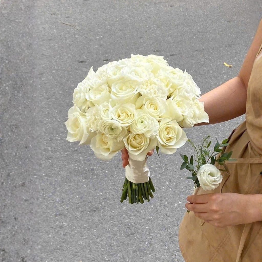 Vẻ đẹp mềm mại và tròn đầy của hoa hồng trắng khiến bàn tay cô dâu trở nên nổi bật trong từng góc máy, đặc biệt là khi ánh sáng tự nhiên chạm vào — tạo hiệu ứng “golden hour” đúng như tên gọi. Bó hoa phù hợp với những cô dâu thích sự trang nhã, nhẹ nhàng nhưng vẫn muốn giữ lại nét lãng mạn truyền thống.