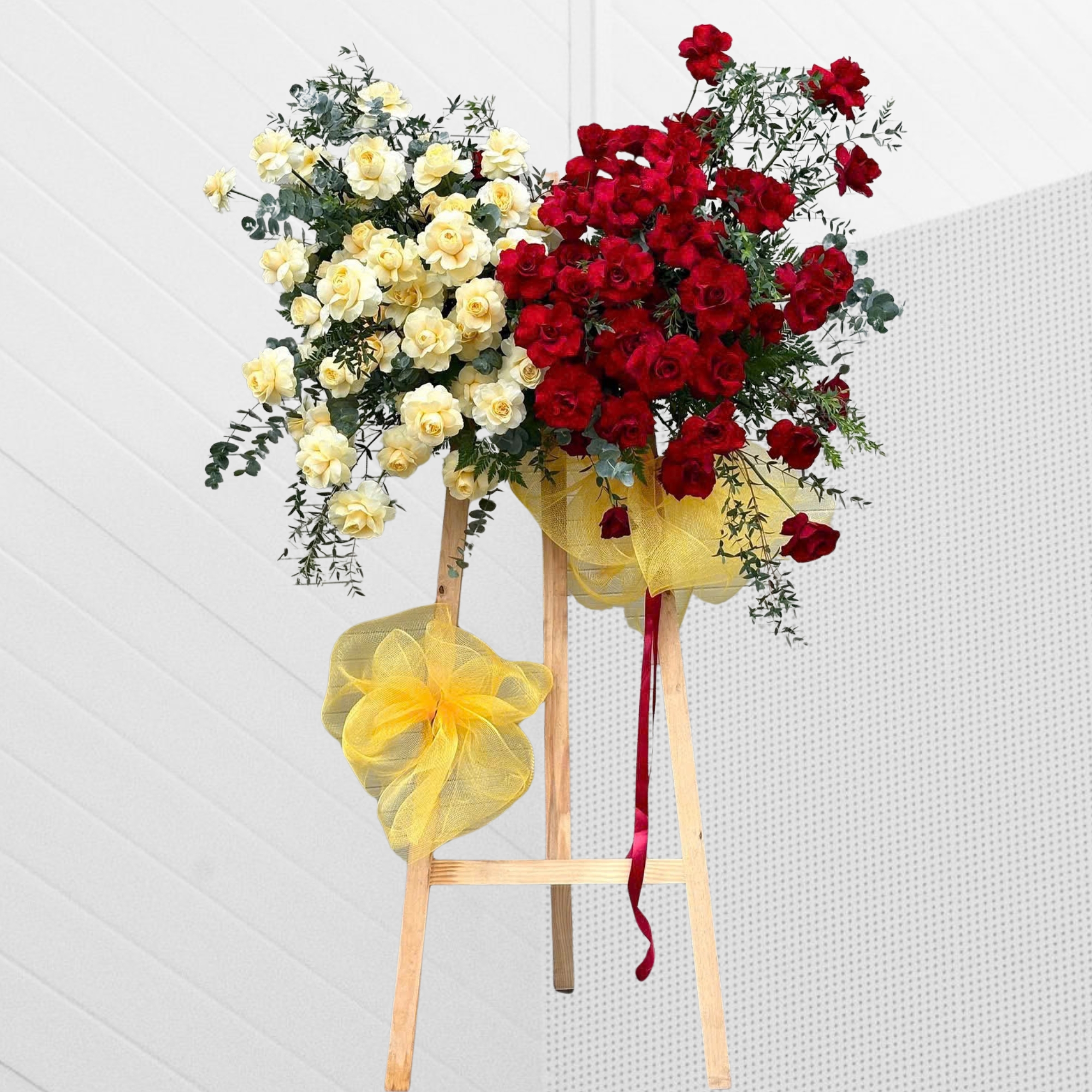 Không thể thiếu những lá phụ như lá bạc và lá kiếm lưới vàng, giúp kệ hoa thêm phần thanh thoát và nổi bật. Các chi tiết tinh tế này không chỉ làm tăng vẻ đẹp của kệ hoa mà còn mang lại sự may mắn, thịnh vượng cho người nhận.