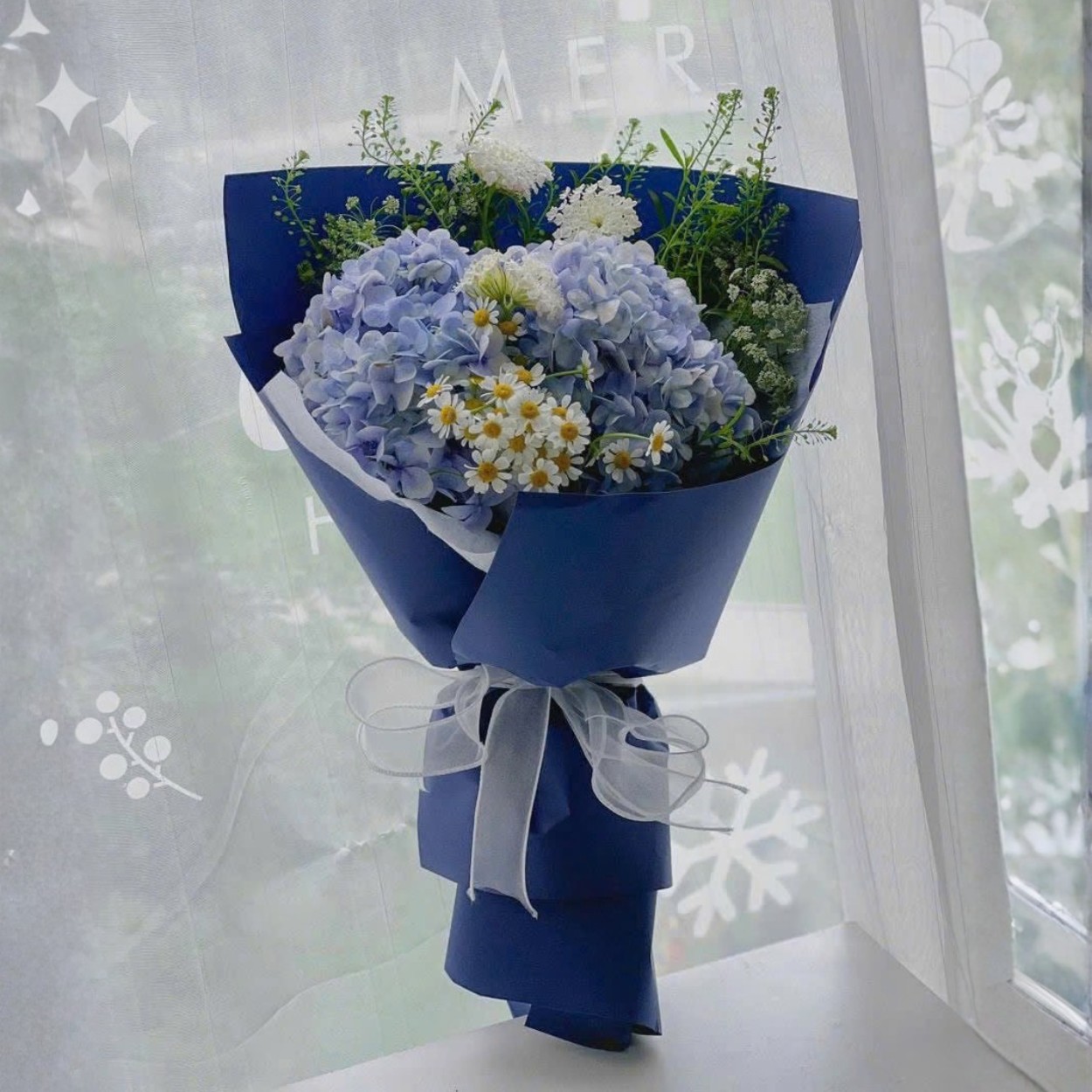 Có những bó hoa không cần rực rỡ để gây ấn tượng. “Hạ vũ” chọn cách chạm vào cảm xúc bằng sự trong trẻo: sắc cẩm tú cầu xanh nhạt như hơi nước đọng trên cửa kính, thoáng mát, hiền và sâu. Nhìn tổng thể, bó hoa giống một cơn mưa mùa hạ vừa tạnh—để lại bầu không khí sạch sẽ, dễ thở, và một cảm giác an yên rất khó gọi tên.