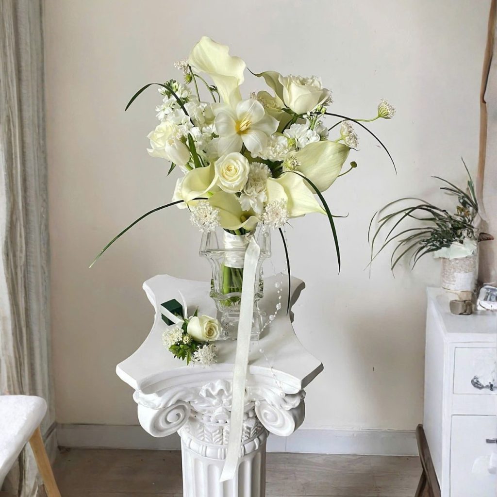 Điểm đặc biệt của bó hoa này chính là tính linh hoạt, dễ dàng kết hợp với các kiểu váy cưới khác nhau, từ cổ điển đến hiện đại, giúp cô dâu luôn nổi bật trong mọi khoảnh khắc. Được chăm chút kỹ lưỡng từ khâu lựa chọn hoa đến cách bày trí, bó hoa cưới này chắc chắn sẽ là điểm nhấn hoàn hảo cho ngày trọng đại của bạn.