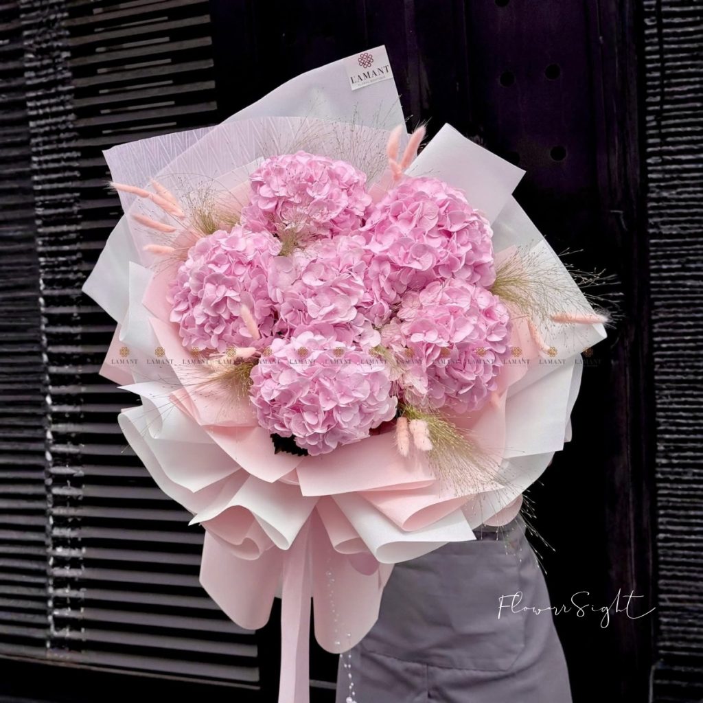 Bó hoa được thiết kế từ những cụm cẩm tú cầu hồng tròn đầy, tạo nên tổng thể mềm mại, như một cái ôm êm ái. Khi nhìn vào, người ta không chỉ thấy hoa – mà thấy cả sự nâng niu.