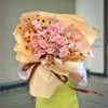 Happy Mistake được thiết kế theo dáng bó tròn tự nhiên, hoa nở vừa độ, không quá dày cũng không quá thoáng. Hoa hồng hồng được chọn lọc kỹ lưỡng, xếp đan xen tạo chiều sâu thị giác, mang lại cảm giác mềm và “thở được” cho toàn bộ bó hoa. Xen giữa là hoa cúc vàng nhỏ – loài hoa mang sắc thái vui tươi, tạo điểm nhấn tinh tế mà không làm mất đi sự dịu dàng vốn có.Phần giấy gói sử dụng tone kem – nude nhẹ, nhiều lớp xếp mềm mại, giúp bó hoa trông bồng bềnh nhưng vẫn gọn gàng. Chiếc nơ nâu trầm được thắt vừa tay, không quá nổi bật, đóng vai trò như một dấu chấm lặng – đủ để giữ bố cục cân bằng và tạo cảm giác chỉn chu.