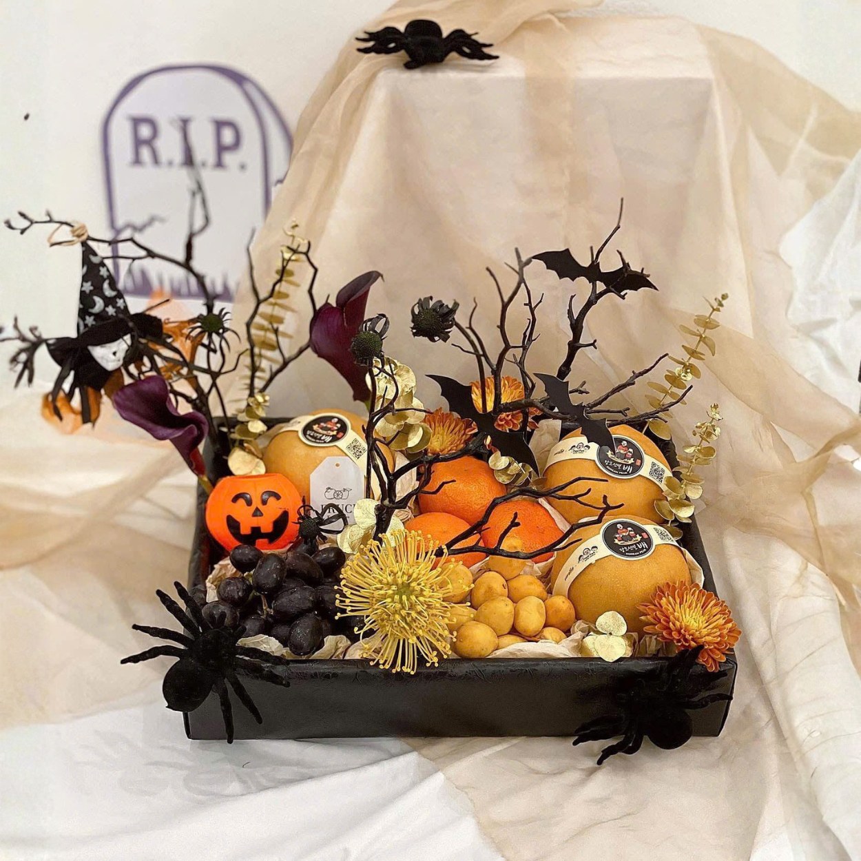 Haunted house không chỉ là một giỏ quà; đó là một cảnh trí Halloween thu nhỏ – nơi sắc đen huyền bí ôm lấy vị ngọt tươi của trái cây, còn những bông cúc như tia sáng dẫn lối, kể trọn câu chuyện “rùng rợn mà sang”. Một món quà độc nhất để thắp cảm hứng cho cả bàn tiệc.
