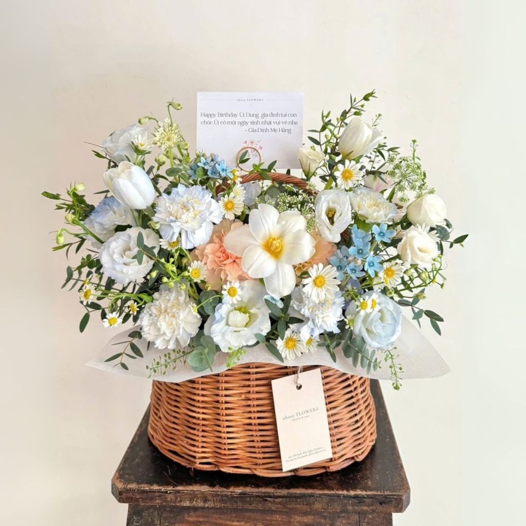 Bước đến gần là thấy ngay cảm giác an yên như vừa mở cửa một khu vườn buổi sớm. Hoa hải đường là tên gọi trìu mến chúng tôi dành cho thiết kế tulip lấy cảm hứng từ sắc trời trong và gió nhẹ đầu ngày. Từng bông tulip trắng kiêu hãnh vươn lên, ôm quanh là cát tường mềm mại, cúc tana nhỏ xinh, những nhánh tuyết mai thanh mảnh và chấm phá của cỏ đồng tiền, hoa cà rốt. Tất cả được nâng niu bên trong giỏ mây đan thủ công, có lớp giấy lót trong trẻo và nơ buộc tinh gọn. Không phô trương, không ồn ào, bó hoa đem đến một vẻ đẹp thanh lịch, tươi mới và thuần khiết, hợp với những ai yêu sự tự nhiên và chuộng tinh thần tối giản nhưng vẫn đủ sâu.