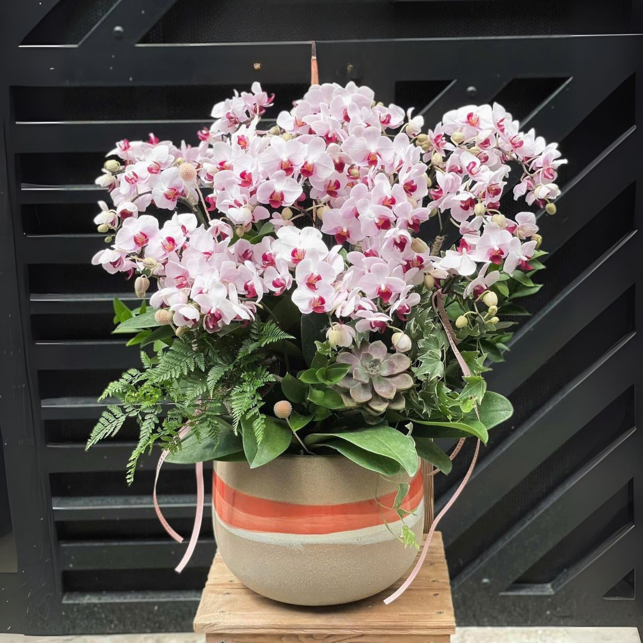 Hoàng Đạo là chậu hoa lan mang đậm vẻ đẹp nhẹ nhàng và tinh tế, với sắc hồng nhạt từ những đóa lan hồ điệp được phối cùng sen đá và dương xỉ xanh tươi. Món quà này không chỉ mang tính thẩm mỹ cao mà còn truyền tải thông điệp tốt lành trong nhiều dịp như sinh nhật, thăng chức hay tân gia.