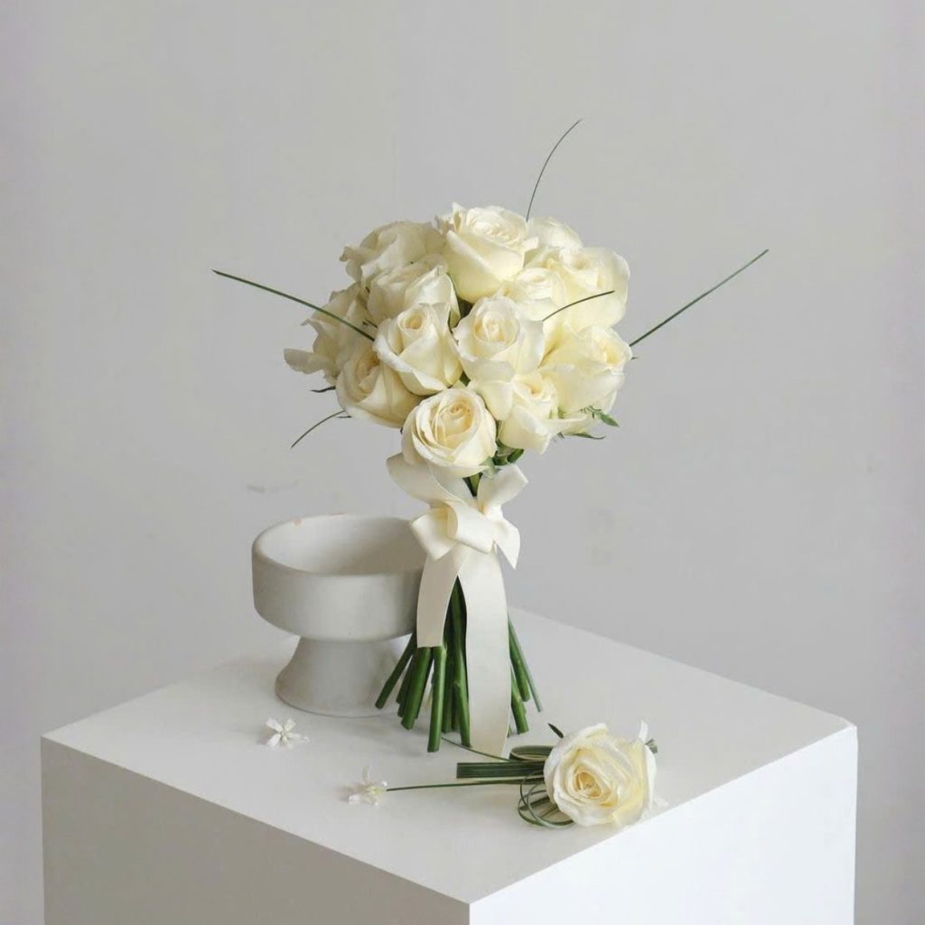 Bó hoa cưới này bao gồm các thành phần đặc biệt như hồng trắng, lá phụ, và một chiếc nơ sang trọng, tất cả đều hòa quyện với nhau tạo nên một tác phẩm nghệ thuật đầy cảm xúc. Những bông hoa hồng trắng mang trong mình ý nghĩa của sự trong sáng, tình yêu thuần khiết, và những chiếc lá xanh tươi tạo nên sự tươi mới, đầy hy vọng cho đôi lứa trong ngày trọng đại.