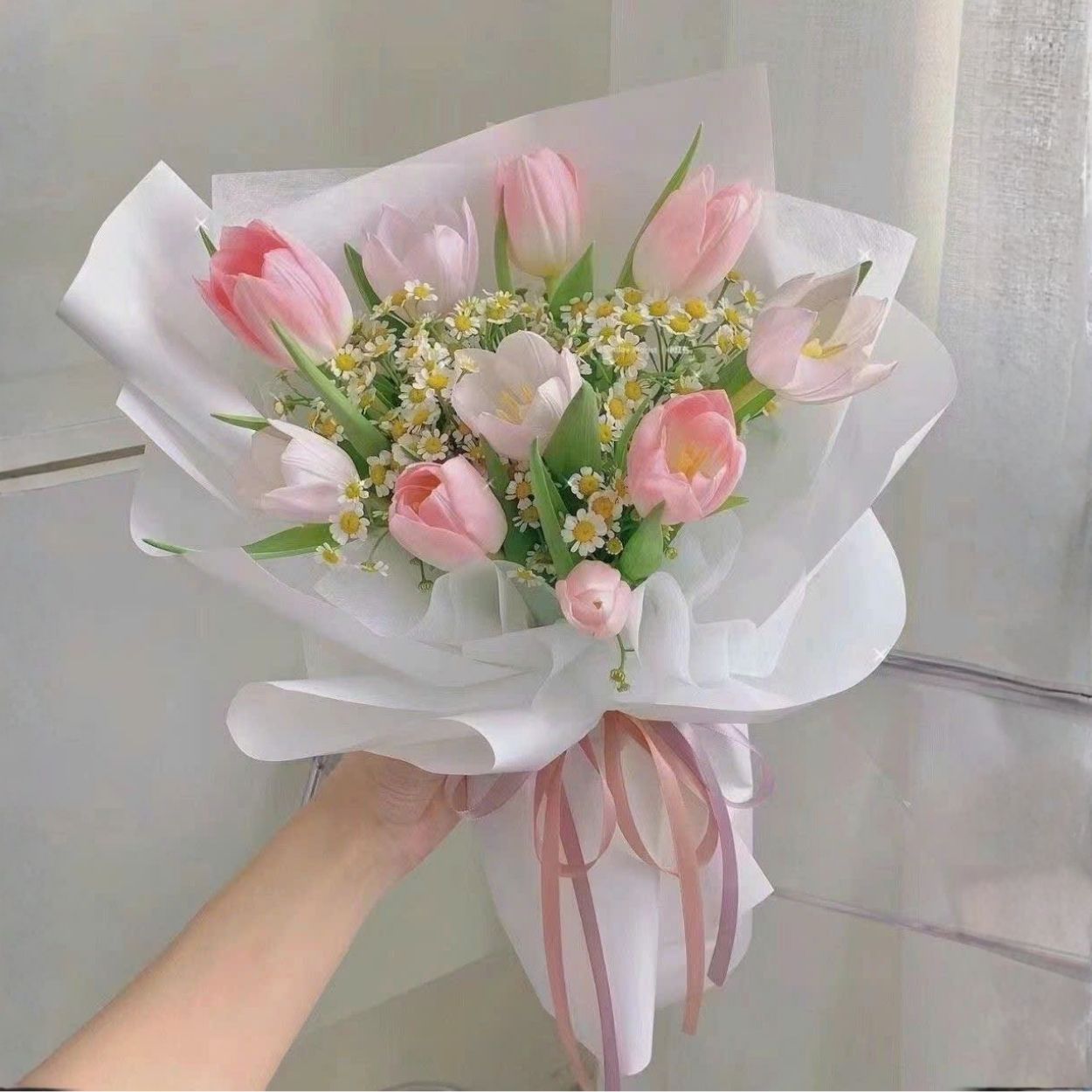 Tulip – loài hoa của sự hoàn hảo và niềm tin – gợi nhắc đến những điều tốt đẹp sắp tới, trong khi cúc tana nhẹ nhàng như lời chúc may mắn, bình an.
