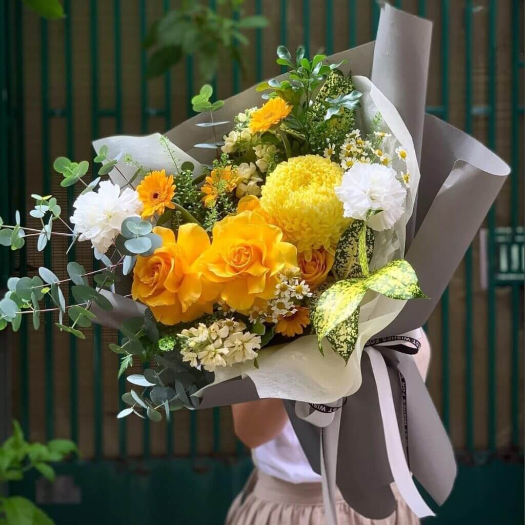 Bên cạnh hoa hồng vàng, mẫu hoa đẹp còn bao gồm hoa mẫu đơn hà lan, phi yến và đồng tiền. Hoa mẫu đơn hà lan với những cánh hoa to và sắc màu tươi sáng mang đến vẻ đẹp kiêu sa. Hoa phi yến thanh thoát và hoa đồng tiền rực rỡ giúp tạo nên một bó hoa đầy sức sống.