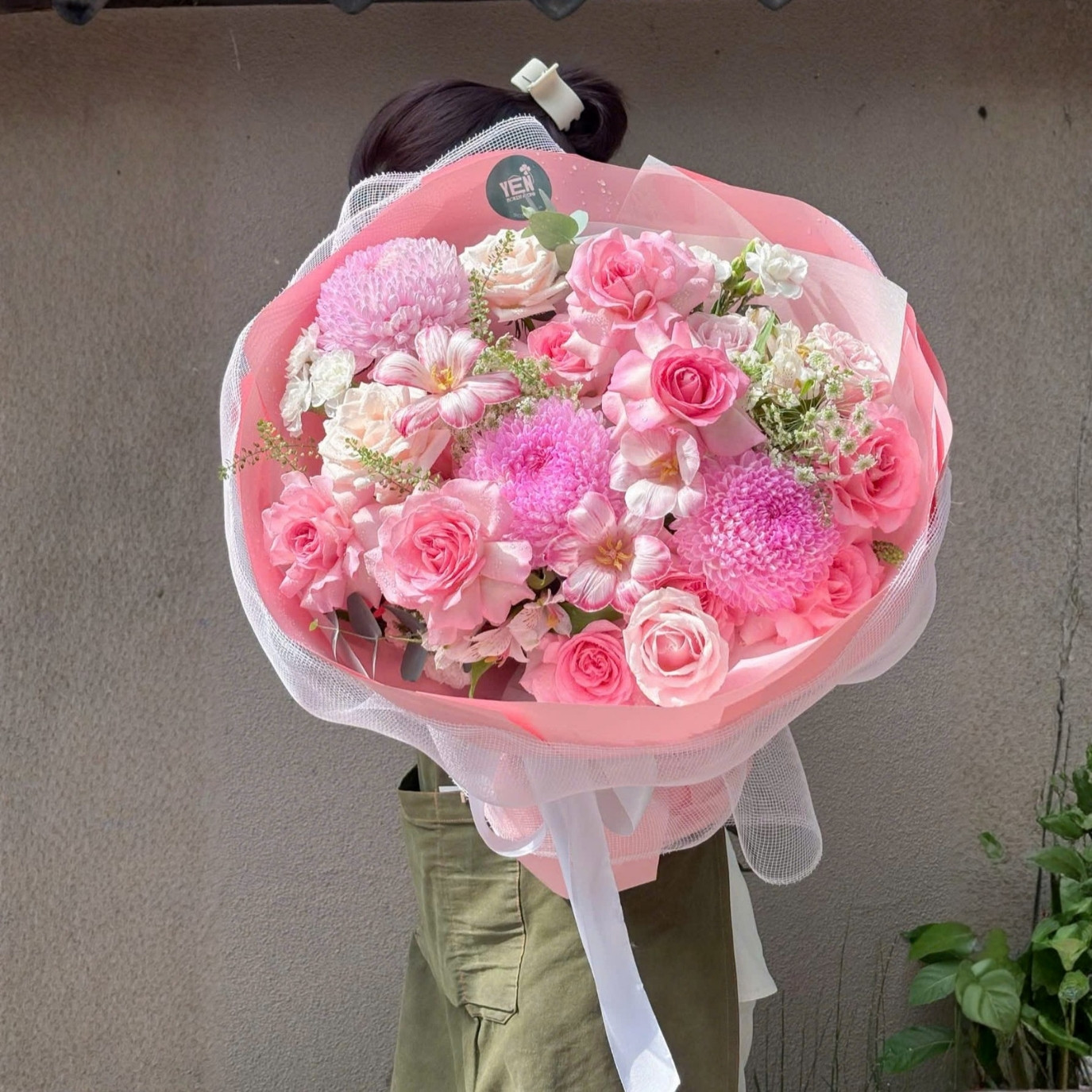Bó hoa How You Feel là sự hòa quyện khéo léo giữa nhiều loài hoa quen thuộc nhưng được sắp đặt theo một cách rất riêng. Hoa hồng giữ vai trò trung tâm, với những cánh hoa xếp lớp mềm mại, tượng trưng cho tình yêu bền bỉ và sự quan tâm âm thầm. Xen kẽ là tulip với dáng hoa thanh thoát, mang lại cảm giác tinh khiết và trang nhã.Cúc mẫu đơn góp phần tạo điểm nhấn về khối, giúp bó hoa trở nên đầy đặn nhưng không nặng nề. Những bông cẩm chướng nhỏ được cài cắm tinh tế, như những lời hỏi han nhẹ nhàng, rất đời nhưng cũng rất tình. Hoa cà rốt và cỏ đồng tiền đóng vai trò hoa điểm, tạo độ thoáng, giúp bố cục bó hoa có nhịp thở tự nhiên hơn.Phần giấy gói được chọn với sắc hồng phấn trong trẻo, kết hợp lớp lưới mỏng tạo hiệu ứng mềm và sâu. Nơ buộc đơn giản, không cầu kỳ, để tổng thể bó hoa giữ được tinh thần nhẹ nhàng, đúng với tên gọi “How You Feel”. Cách gói này giúp bó hoa vừa có độ chắc chắn, vừa mang vẻ mong manh đầy cảm xúc.