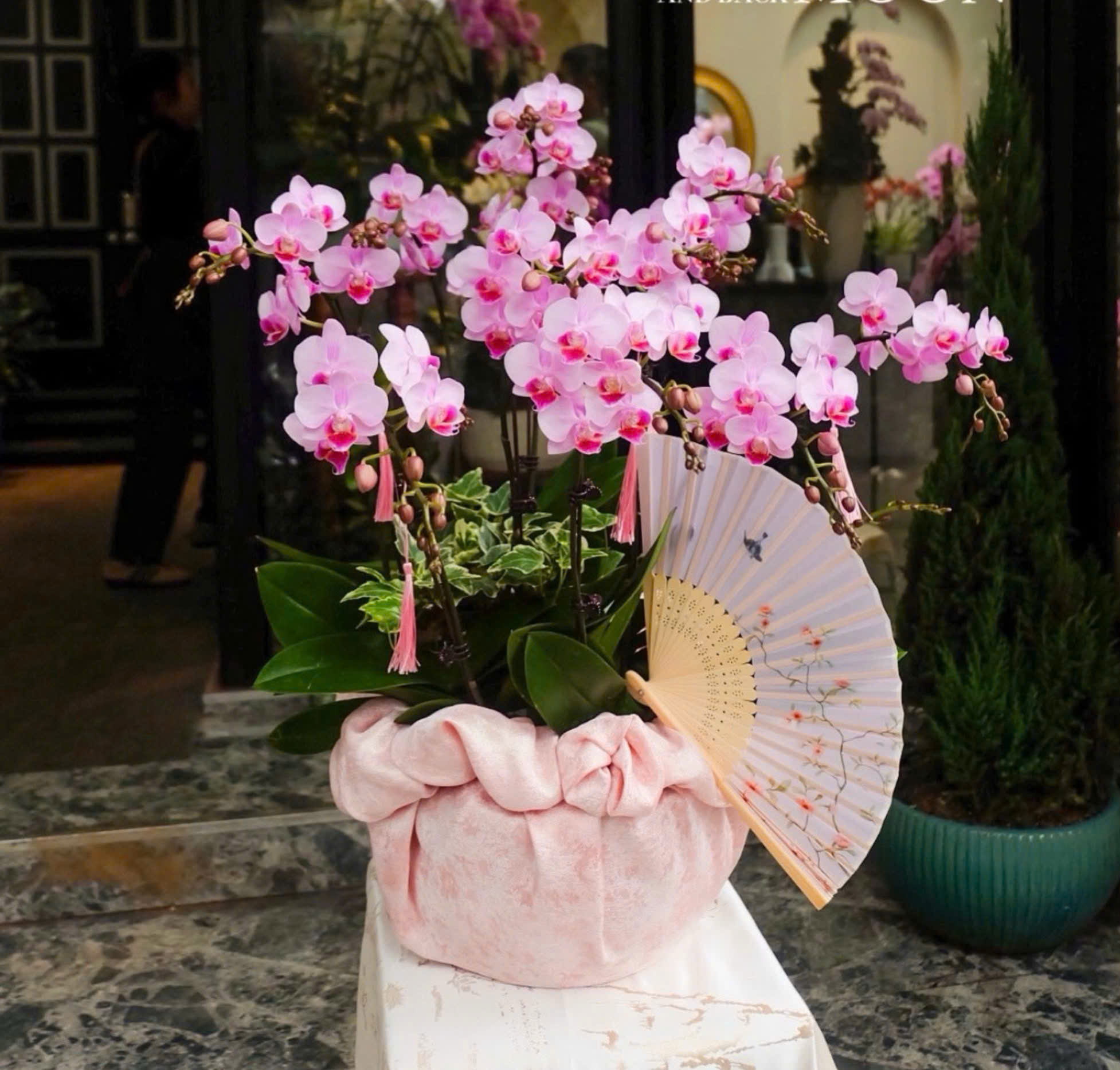Hưng Thịnh là chậu hoa tinh tế, kết hợp lan hồ điệp, vải, quạt và lá phụ, mang sắc màu hài hòa và ý nghĩa sang trọng. Đây là món quà lý tưởng để tặng sếp dịp Tết, sinh nhật, thăng chức hoặc khi hoàn thành dự án quan trọng.