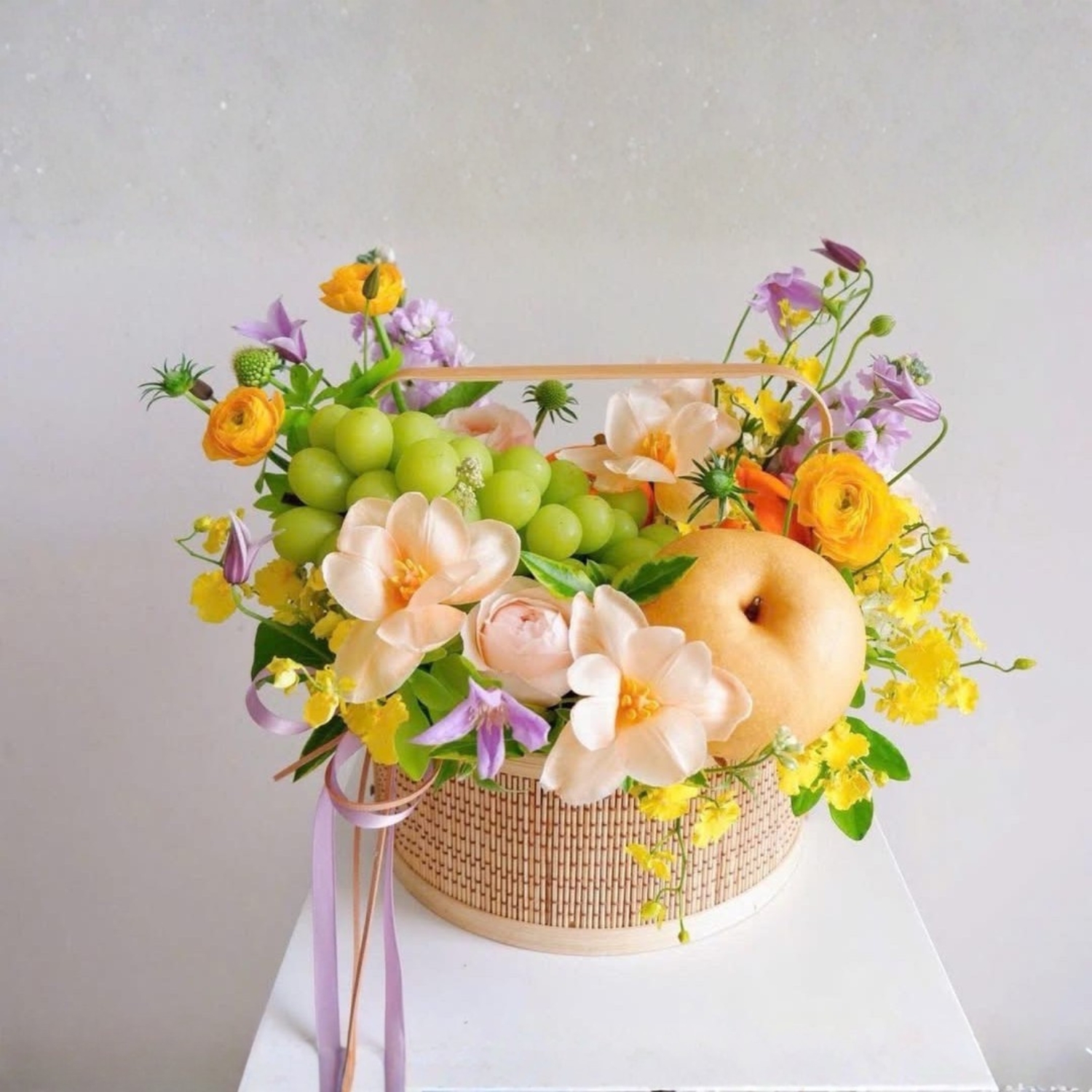 Thiết kế sử dụng tông màu pastel chủ đạo, điểm xuyết sắc vàng của lan vũ nữ, sắc kem của hồng Juliet và nét mềm mại của tulip. Xen kẽ là những cụm nho mẫu đơn xanh mát cùng lê Hàn và táo căng tròn, tạo nên tổng thể hài hòa giữa thị giác và cảm xúc.