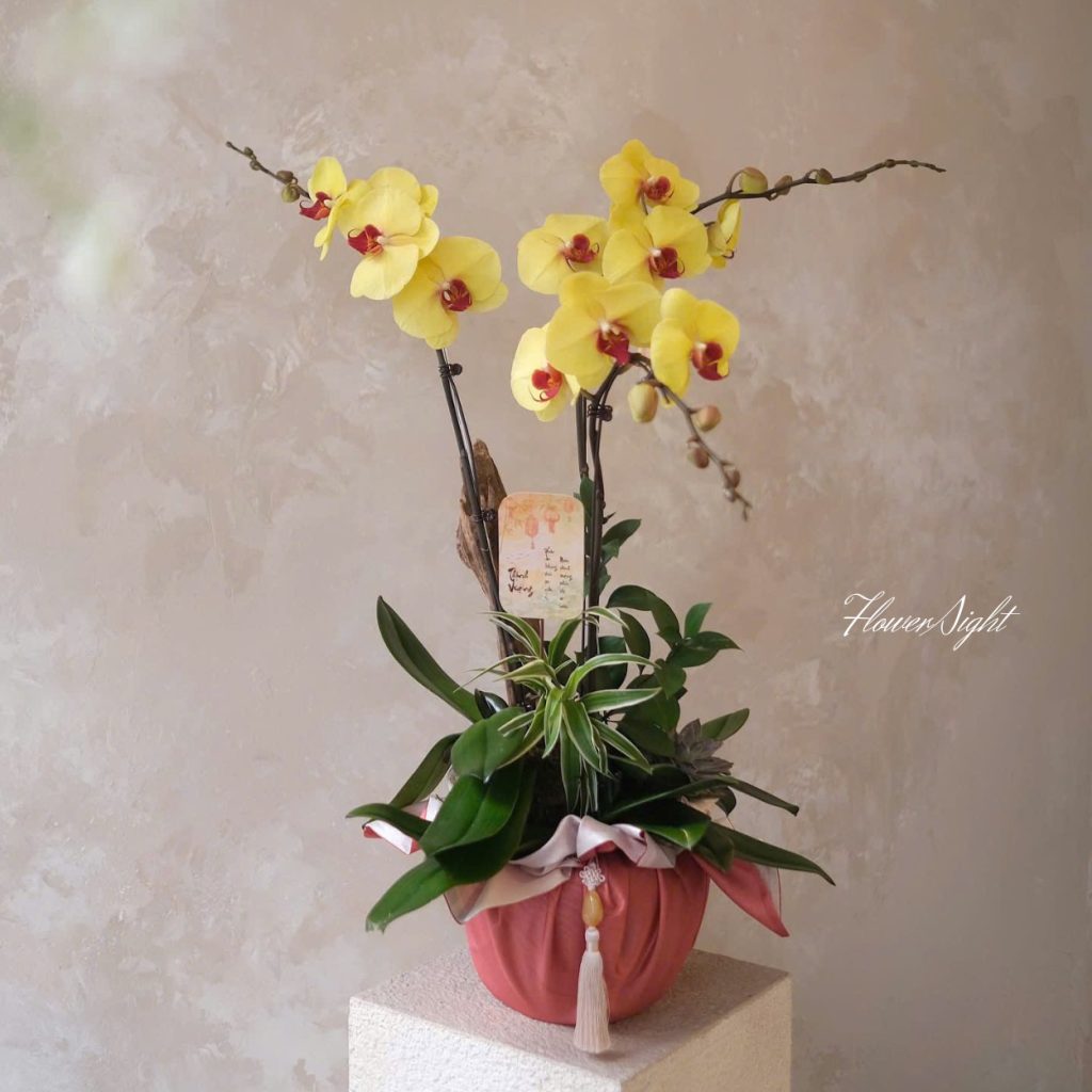 Trong dịp sinh nhật, chậu lan vàng rực rỡ là món quà ý nghĩa để gửi lời chúc an lành, hạnh phúc và tự tin. Sự kết hợp tinh tế giữa lan hồ điệp màu vàng, bách hợp sọc, lũa và vải tạo nên vẻ đẹp thanh lịch, sang trọng. Chậu hoa không chỉ làm đẹp không gian mà còn truyền cảm hứng, thể hiện sự trân trọng và ngưỡng mộ dành cho người nhận.