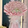 Điều dễ thương của I Like You nằm ở cách phối màu. Tông hồng phấn chủ đạo được xử lý bằng nhiều lớp giấy gói có độ mờ vừa phải, xếp nếp kiểu cánh hoa, tạo cảm giác bồng bềnh. Phần nơ là điểm chốt: lớp voan/lưới trắng mềm phủ bên ngoài, kết hợp ruy băng rơi dài, khiến bó hoa trông như đang “thở” – nhẹ, bay, nhưng vẫn có sự chỉn chu. Đây là kiểu form cầm lên chụp cận hay chụp toàn thân đều đẹp vì có đủ độ rộng, độ sâu và chiều rơi.