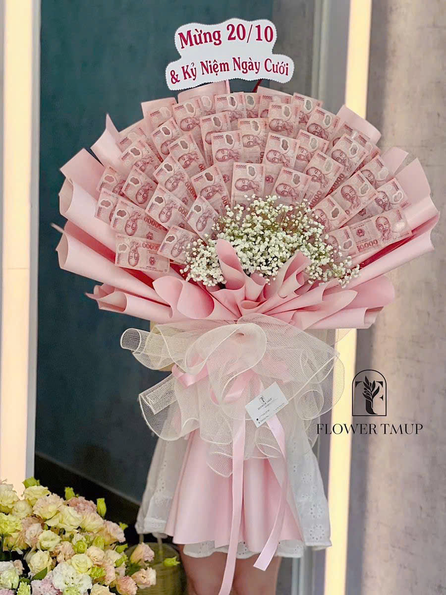 Có những lời tỏ bày không cần nói dài, chỉ cần “đúng vibe” là người nhận tự hiểu. I Like You thuộc danh mục bó hoa tiền là kiểu quà như vậy: nhìn một lần là thấy ngay sự chăm chút. Bó hoa tạo hiệu ứng bung nở như một chiếc quạt lớn, những tờ tiền được xếp đều tay thành nhiều lớp, dựng phom chắc và sạch. Ở trung tâm là cụm hoa baby trắng li ti, làm nhiệm vụ “kéo ánh nhìn” về đúng điểm nhấn, khiến tổng thể vừa sáng vừa nhẹ, không bị nặng cảm giác vật chất.