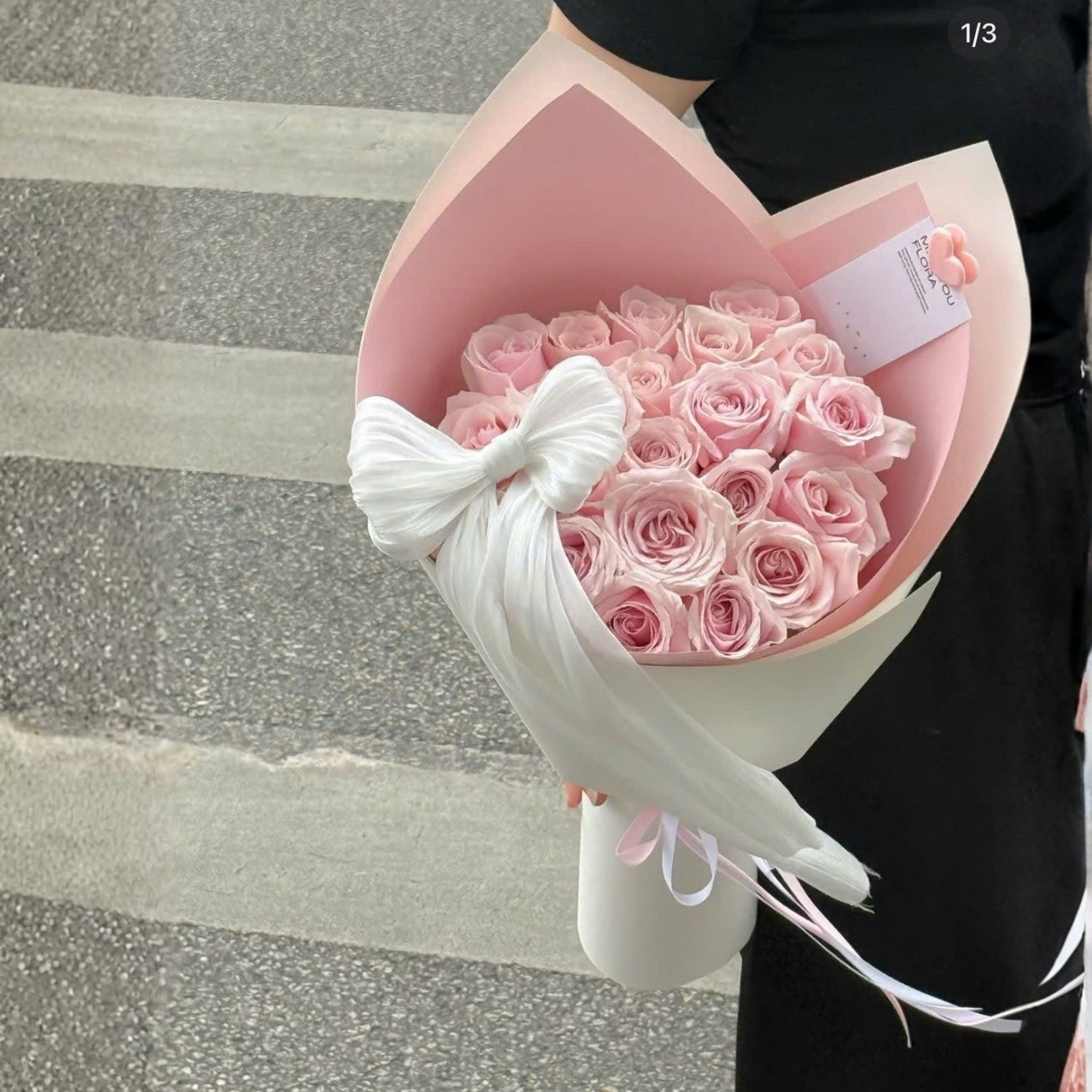 Điểm khiến bó hoa này đặc biệt nằm ở sự “im lặng đẹp”: toàn bộ câu chuyện được kể bằng sắc hồng phấn của hoa hồng, lớp giấy gói pastel và một chiếc nơ trắng lớn như một cái ôm. Không ồn ào, không phô trương – chỉ là cảm giác dịu dàng lan ra rất tự nhiên.