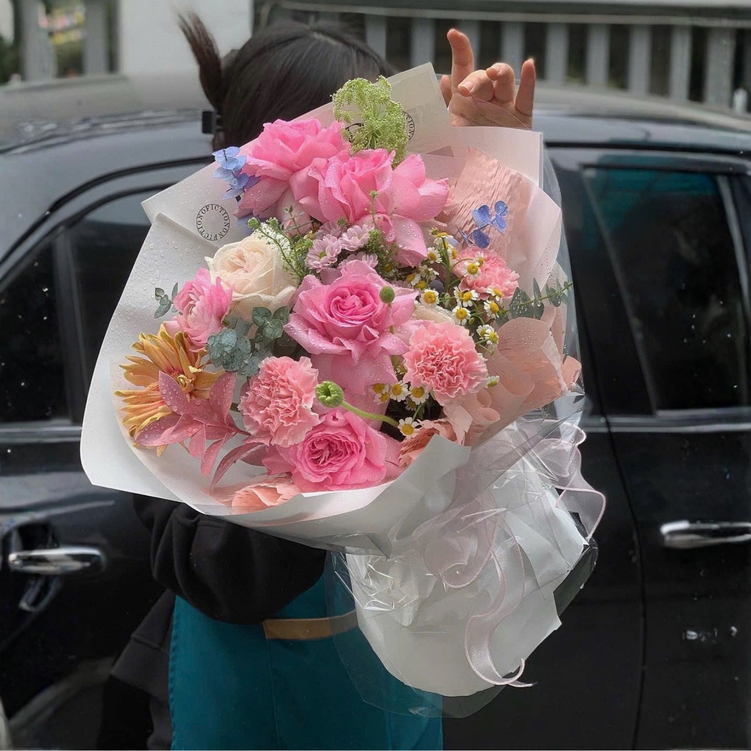 Hoa hồng giữ vai trò trung tâm, với những bông nở vừa độ, cánh mềm và sắc hồng căng tràn sức sống. Bao quanh là cẩm chướng – lớp nền tạo độ đầy và chiều sâu, giúp tổng thể trở nên bồng bềnh hơn.