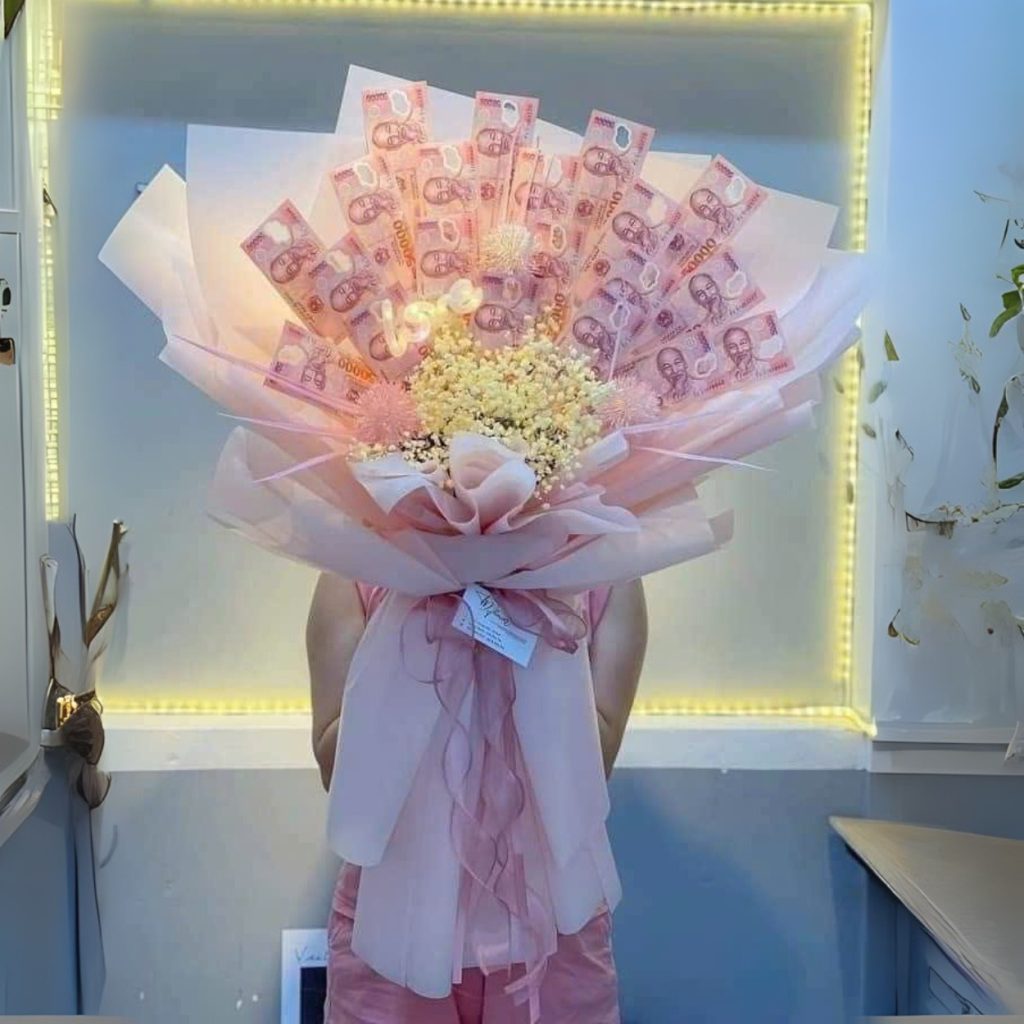 Bó hoa If you được kết hợp hài hòa giữa hoa sao khô – loài hoa tượng trưng cho sự bền lâu – và tờ tiền 50k được gấp khéo léo, đặt xen kẽ một cách tinh tế. Tất cả được bao bọc bởi lớp giấy gói màu hồng và trắng thanh nhã, cùng điểm nhấn là chiếc nơ mềm mại ở trung tâm.
