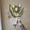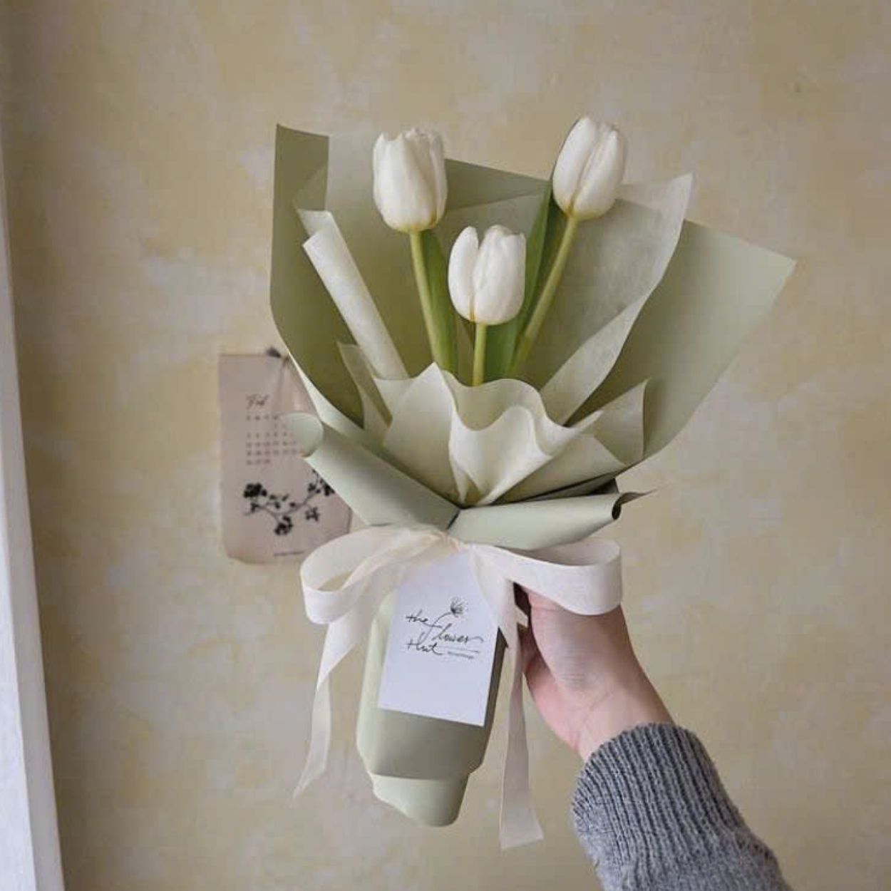 “Iphigenia” chủ đích tiết chế số lượng hoa để tôn đường nét tự nhiên của tulip: cánh thuôn tròn, thân thẳng, nụ khép hờ. Lớp giấy gói xanh olive nhạt ôm bên ngoài tạo nền tĩnh, phía trong là giấy voan mờ màu kem cho hiệu ứng “mây phủ” – vừa nâng đỡ, vừa giữ độ thoáng để từng cánh hoa nổi bật. Nơ ruy-băng lụa bản vừa, thắt mềm tay, cân bằng hình khối phần chuôi bó – nhờ vậy khi cầm cảm giác chắc mà nhẹ, lên ảnh rất “ăn”.